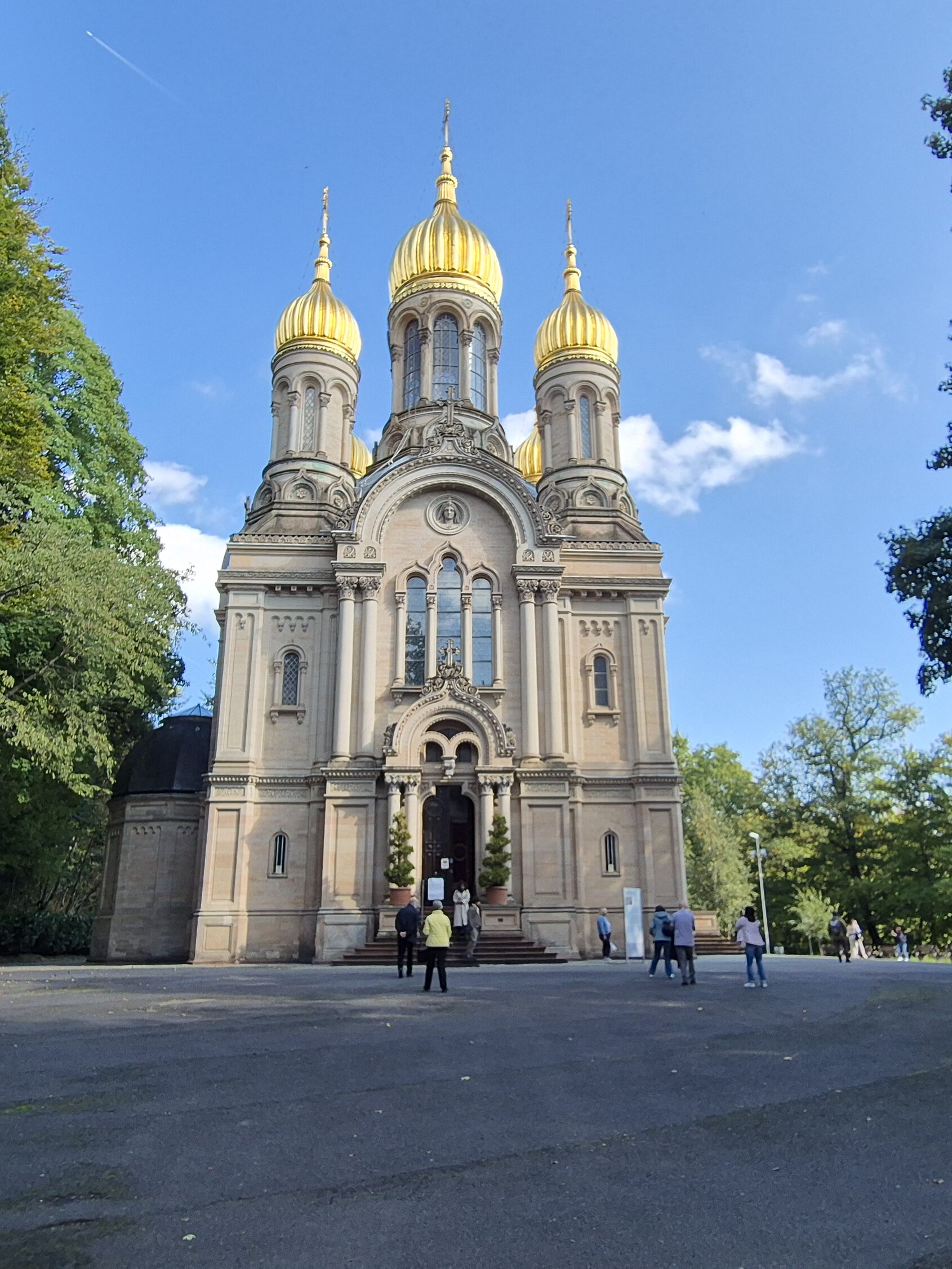 Da kommen natürlich Vergleiche mit der „Russischen Kapelle“ auf dem Neroberg in Wiesbaden auf! Die ist etwa 30 Jahre später entstanden, auch für eine verblichene junge russische Gemahlin. Die hatten scheinbar kein Glück in Deutschland. Architektonisch sind die beiden Kirchen auch ähnlich, zumindest auf den zweiten Blick. Obwohl die Wiesbadener Kapelle deutlich prächtiger daher kommt mit ihren goldenen Kuppeln, hat sie doch den gleichen Grundriss eines überkuppelten Zentralbaus.