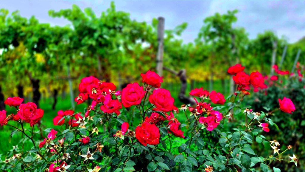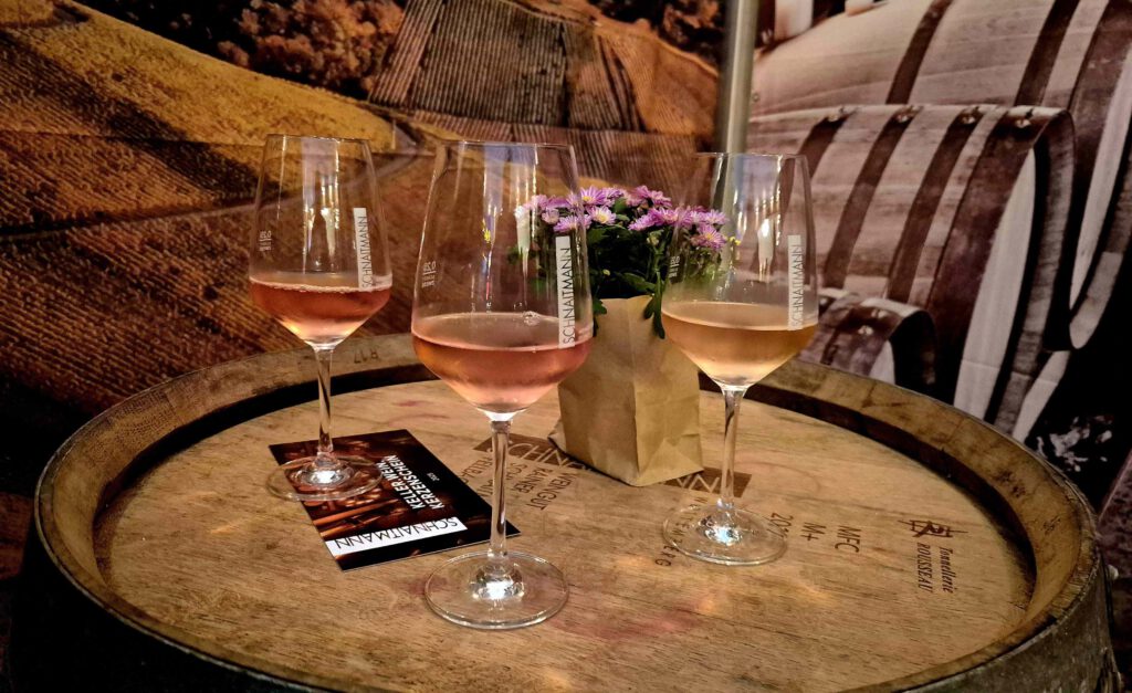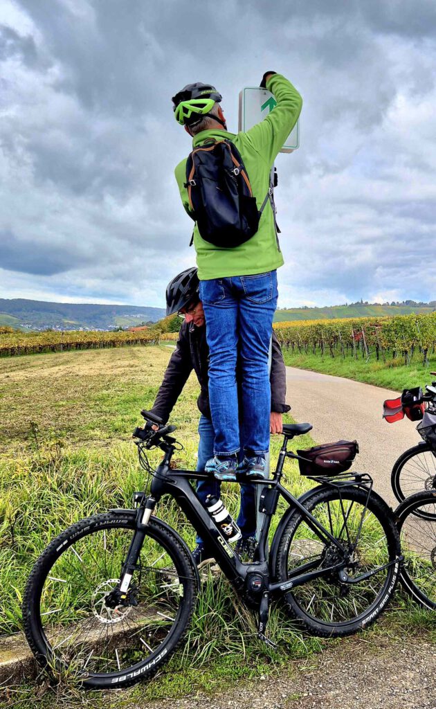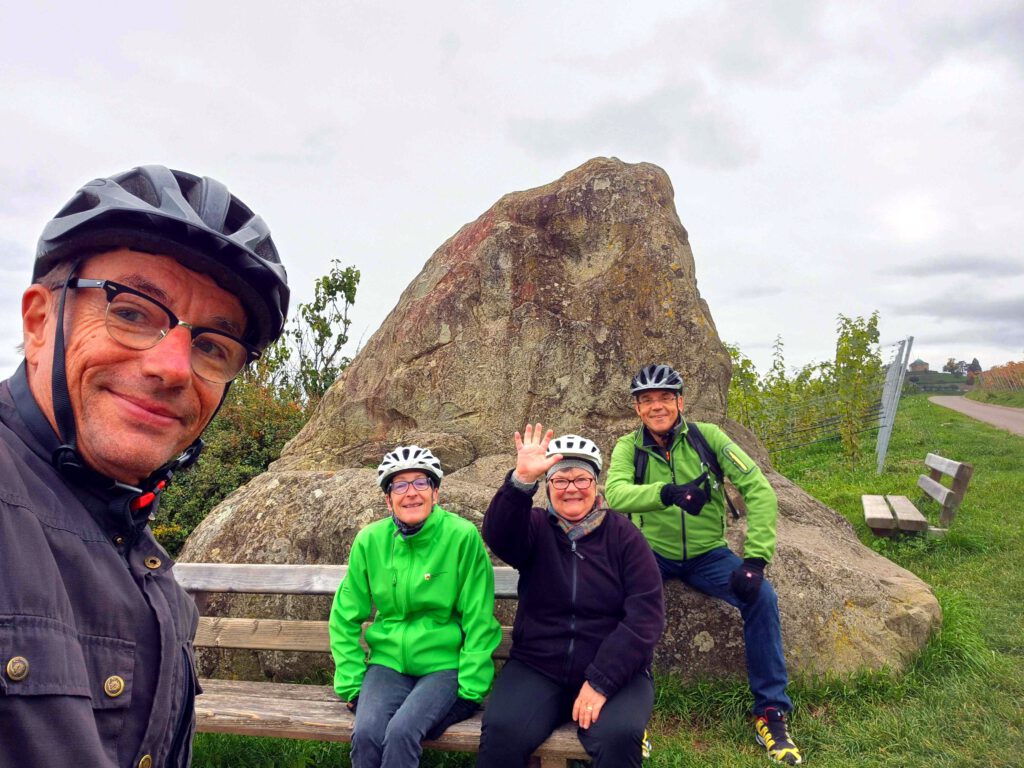 Auf dem weiteren Weg – wir haben es uns gerade auf einem Bänkchen zur Zigarettenpause für K+R gemütlich gemacht – hält ein Bauer mit seinem Traktor neben uns an. Ob wir denn wüssten, wo wir da davor hocken? Wissen wir nicht, also erklärt er es uns: Es ist das Uhlbacher Matterhorn. Den Findling haben die Winzer hier unter großen Mühen hoch gekarrt und jedes Kind klettere hoch, käme dann aber nicht mehr runter, erzählt er uns. Wir sehen von einer Besteigung des Uhlbacher Matterhorns ab und machen statt dessen ein Gruppenselfie.