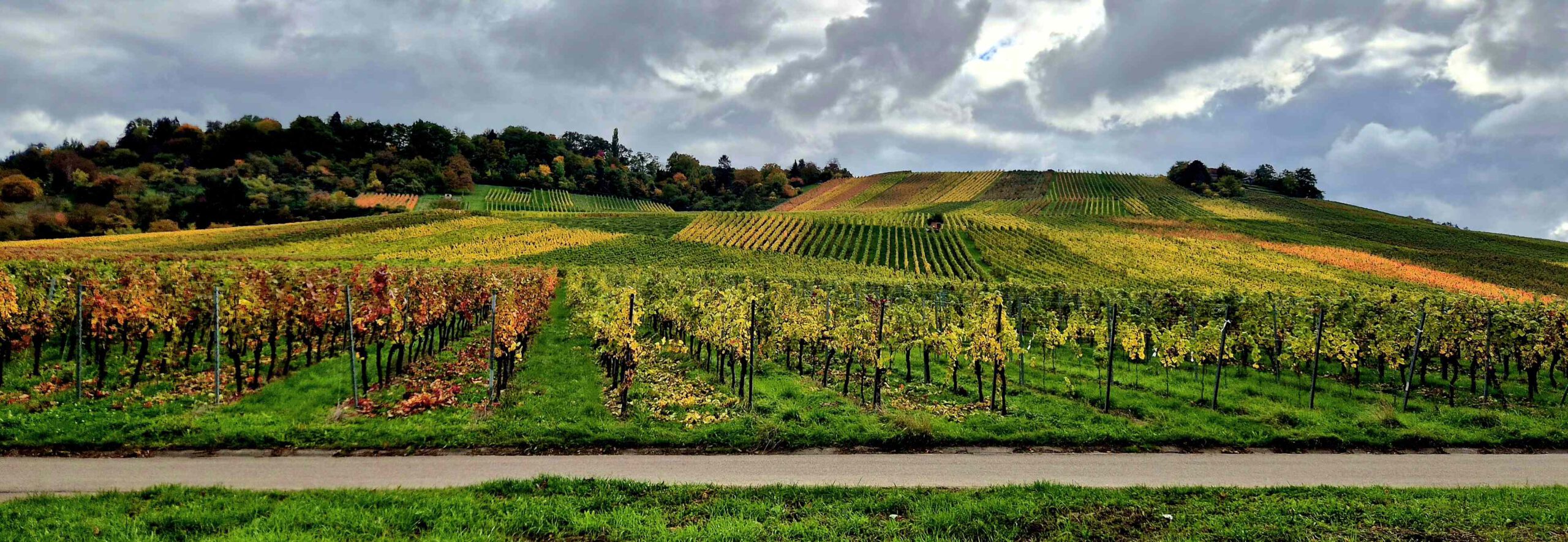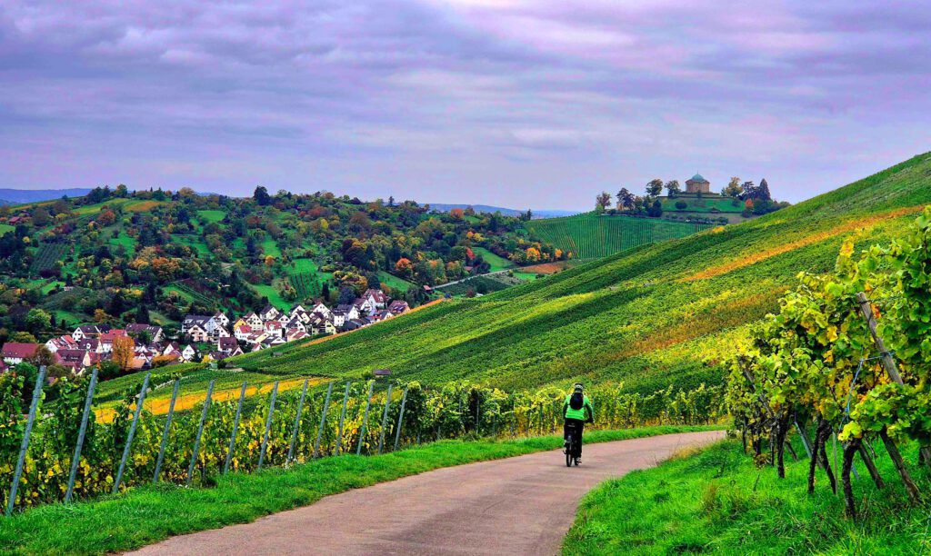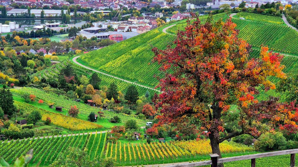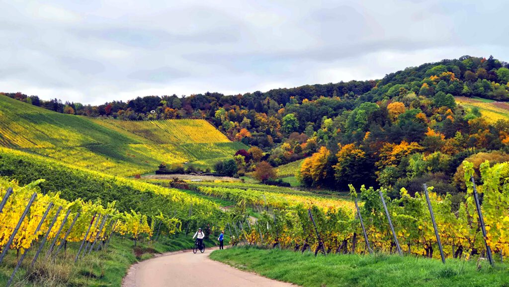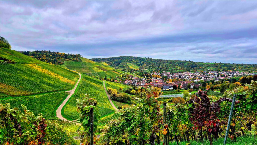 Durch die herrlichen bunten Hügel geht es dann wieder zurück nach Fellbach, wo wir mit Rolf nochmal den Ausklang des Herbstmarktes genießen.