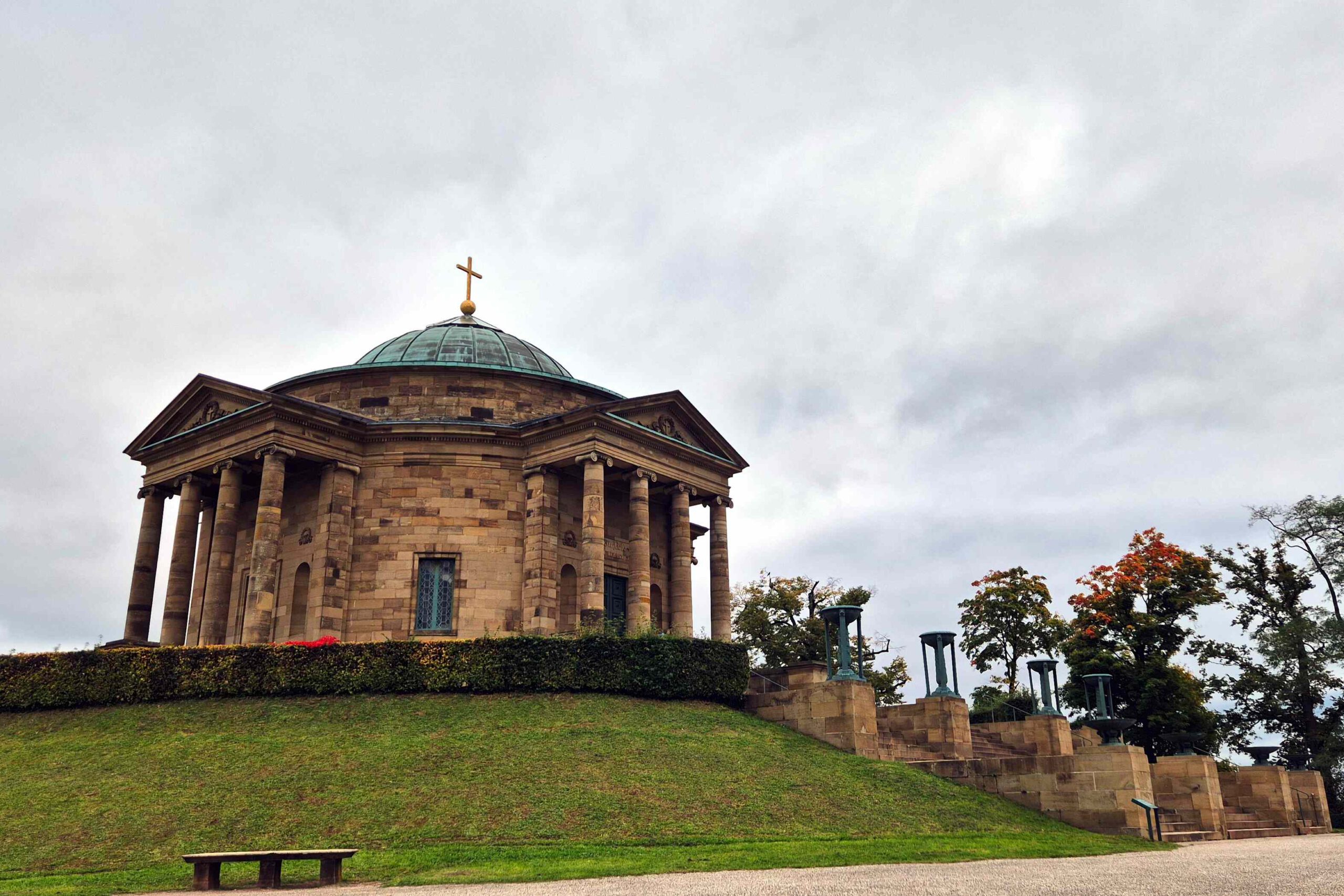 Nach einigem Auf und Ab und dann nochmal viel Auf erreichen wir die Grabkapelle, die König Wilhelm I. von Württemberg (der Sohn des ersten württembergischern Königs, Friedrich I., der uns in Ludwigsburg „begegnet“ ist) für seine jung verstorbene Frau Katharina Pawlowna 1820-1824 errichten ließ.