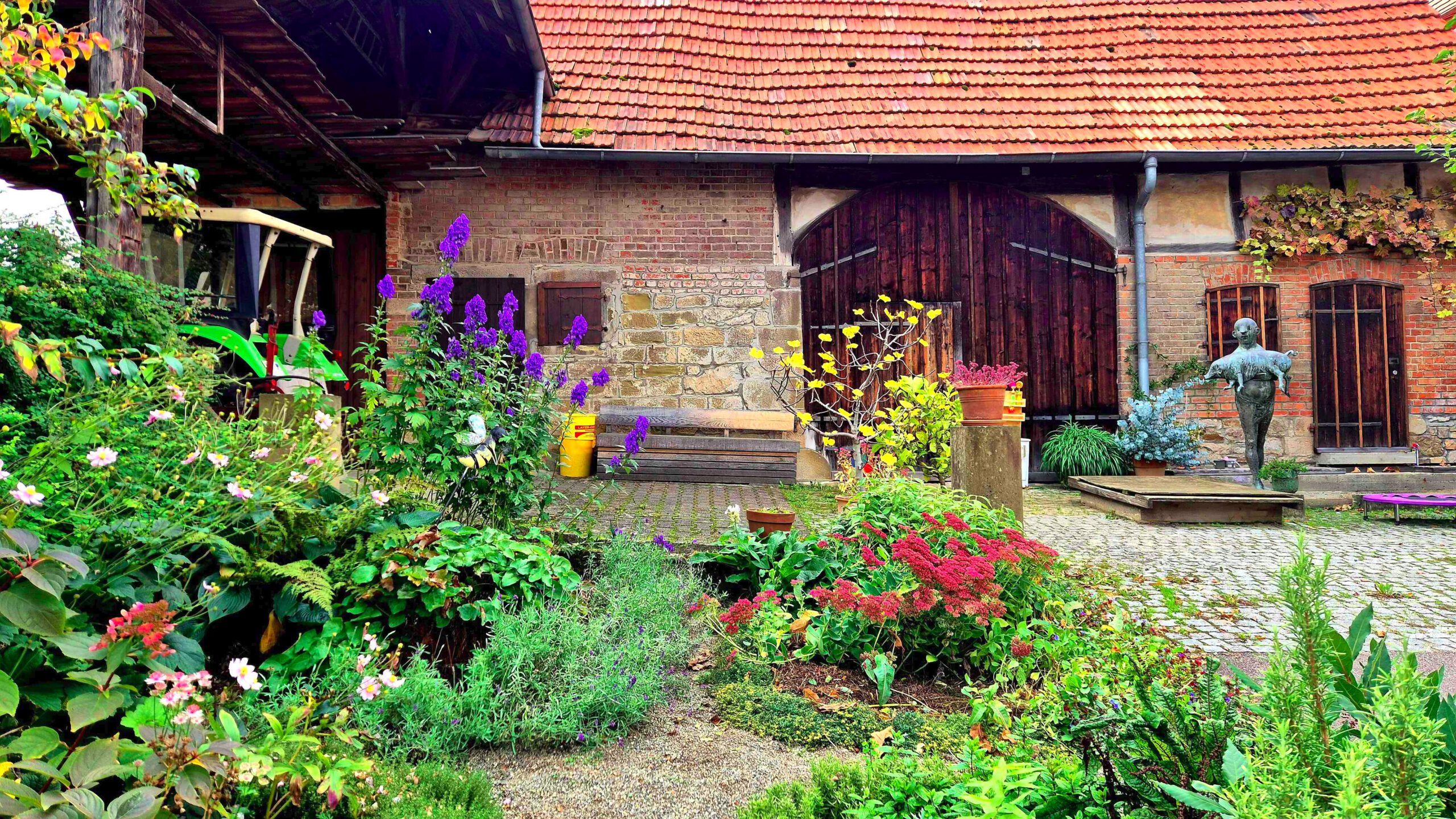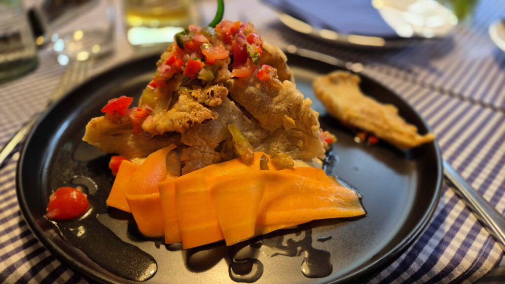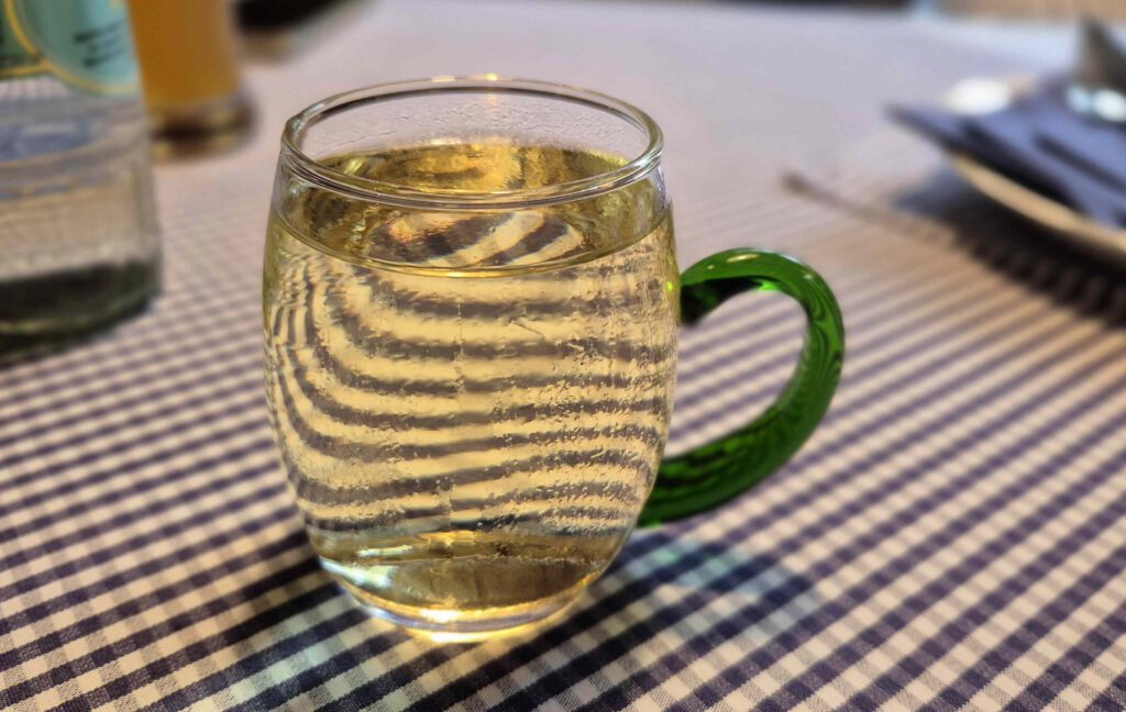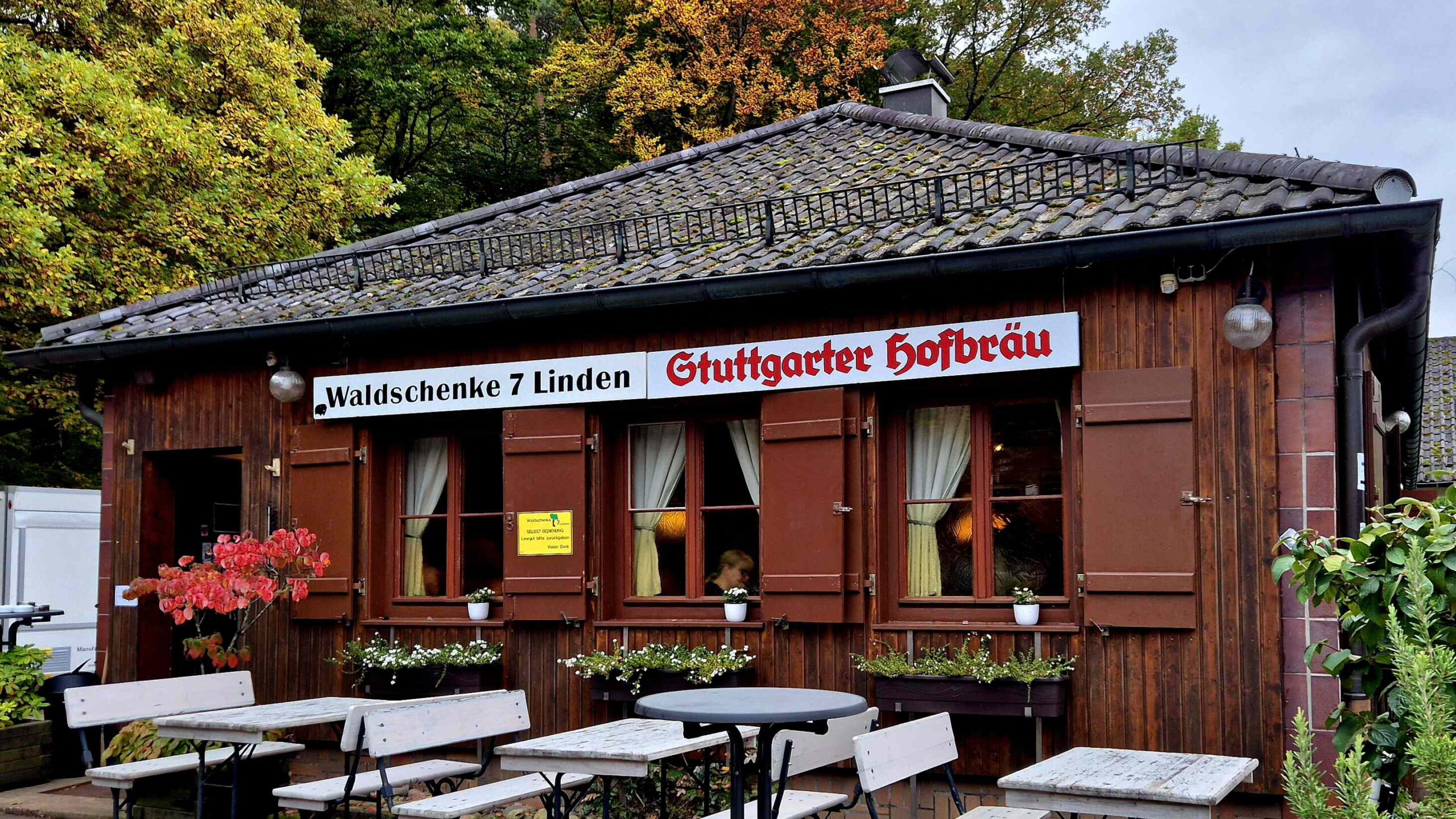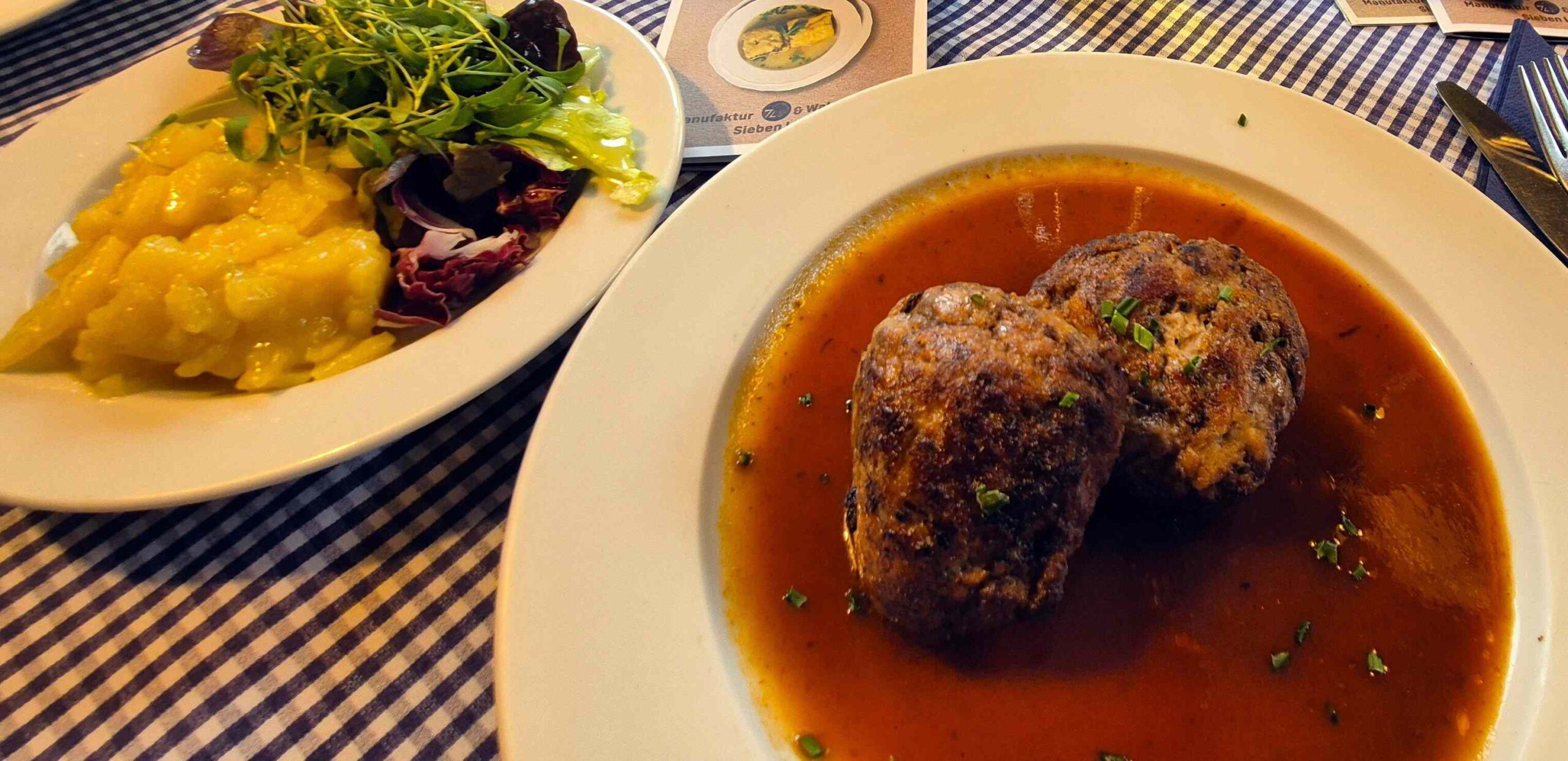 Dann lotst uns Rolf zu einer urigen Kneipe, der Waldschenke 7 Linden, wo wir es uns gutgehen lassen. Neben bodenständigen Gerichten wie Maultaschen, Zwiebelrostbraten und Kässpätzle gibt es auch überraschend „Exotisches“, wie die gebackenen Austernpilze auf Hummus oder knusprig ausgebacken Blumenkohl in Zitronengrassud mit Harissamayonnaise. Tja, der Koch und Inhaber Katranis Evgeniya ist vermutlich schwäbischer Grieche und/oder griechischer Schwabe und peppt das Angebot mit mediterranem Flair auf. Vieles kann man übrigens auch bestellen, es gibt einen Onlineshop.