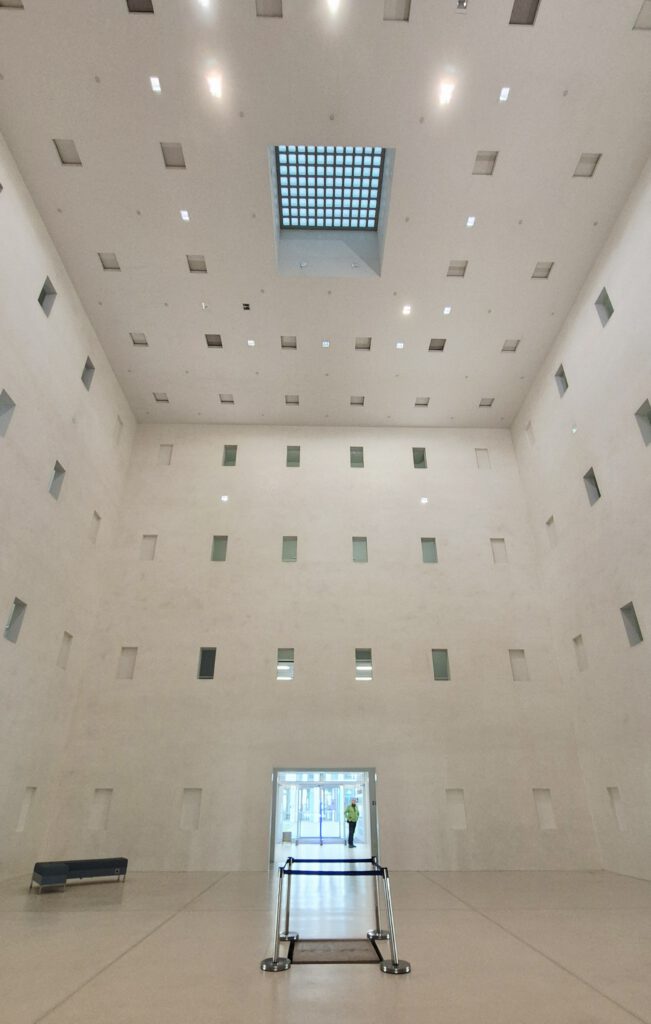 Sie wurde 2011 nach den Plänen eines koreanischen Architekten fertiggestellt und ist ebenso schlicht wie atemberaubend. Ein Monolith aus Glas und Beton, „ein absolut geometrischer, geordneter, weißer Raum als vollkommener Kubus, der durch ein zentrales Oberlicht erhellt wird.“ (Homepage).