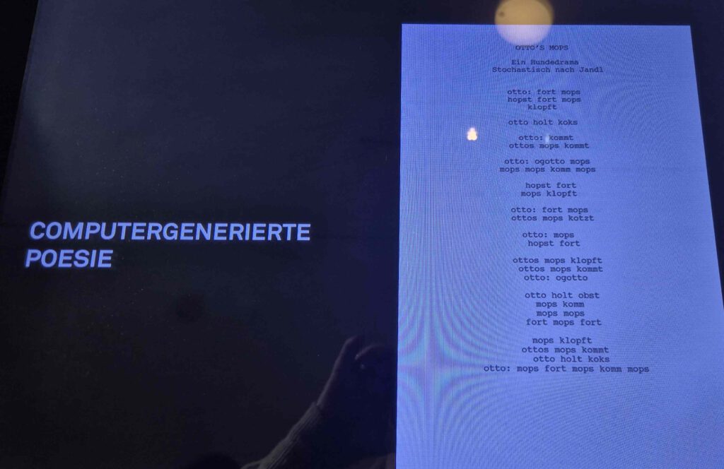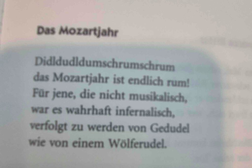 Für den Cache müssen wir einmal durch den gesamten Bau und auf jeder Etage ein Rätsel lösen: Es gilt jeweils ein bestimmtes Buch zu finden und dem eine Info zu entnehmen, was in Summe die Finalkoordinaten ergibt. Zum Beispiel: 52 Romm – Mit welchem Wort beginnt das Gedicht „Das Mozartjahr“? Antwort: Didldudldumschrummschrum! BWW/16-13 = 4=B.