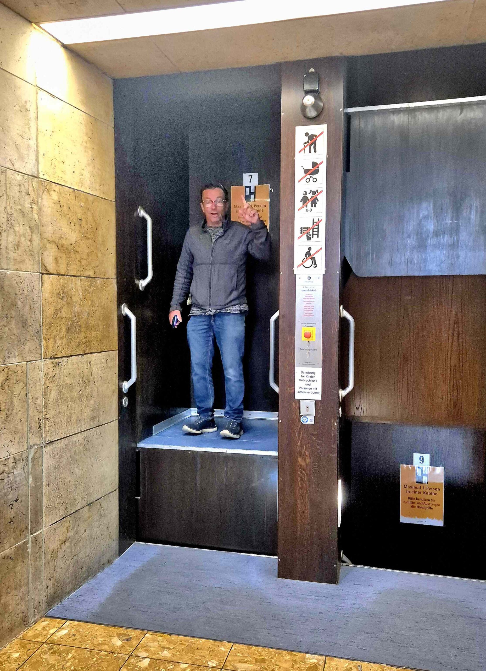 Danach kommt das Highlight, der Paternoster im Stuttgarter Rathaus. Unglaublich, dass man einfach so mit diesem Höllengerät fahren darf 😱. OK, es gibt einige Warnhinweise, aber es ist für jeden frei zugänglich.