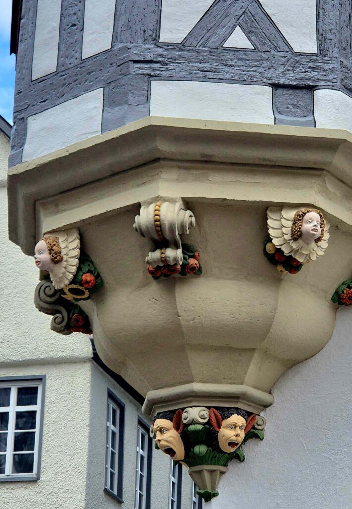 Eine Besonderheit sind die Neidköpfe, im Bild oben rechts an einem Hauserker, die böse Mächte und Geister fernhalten sollten. Ein Relikt aus heidnischer Zeit, dass sich in BaWü ja auch in den Fratzenmasken der Fasnet, dem Karneval, erhalten hat.