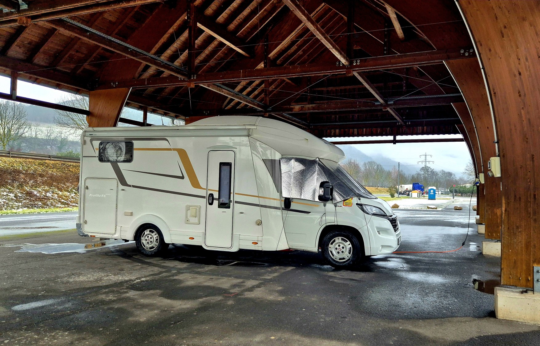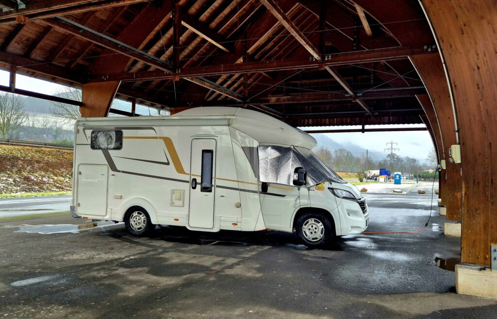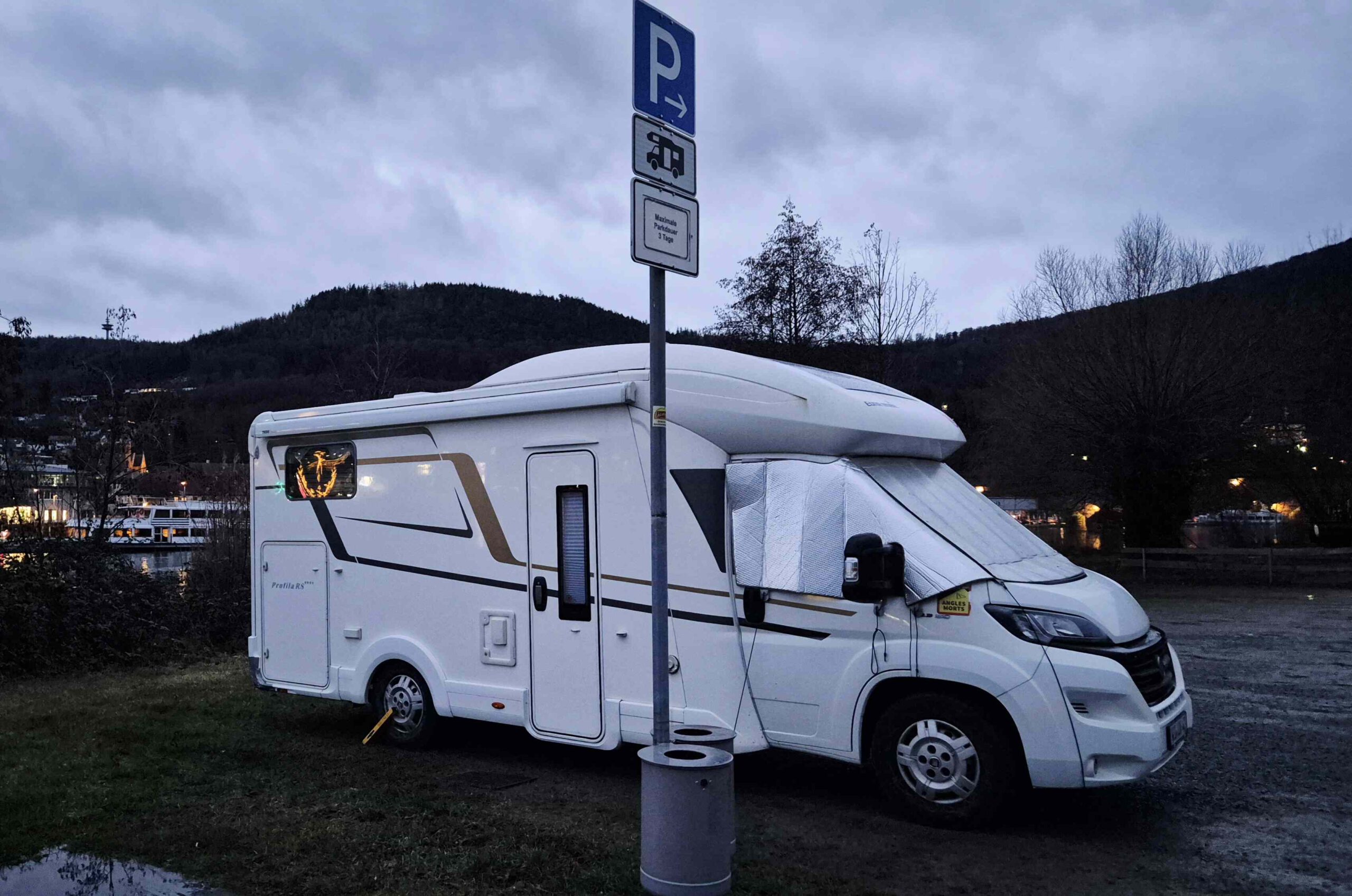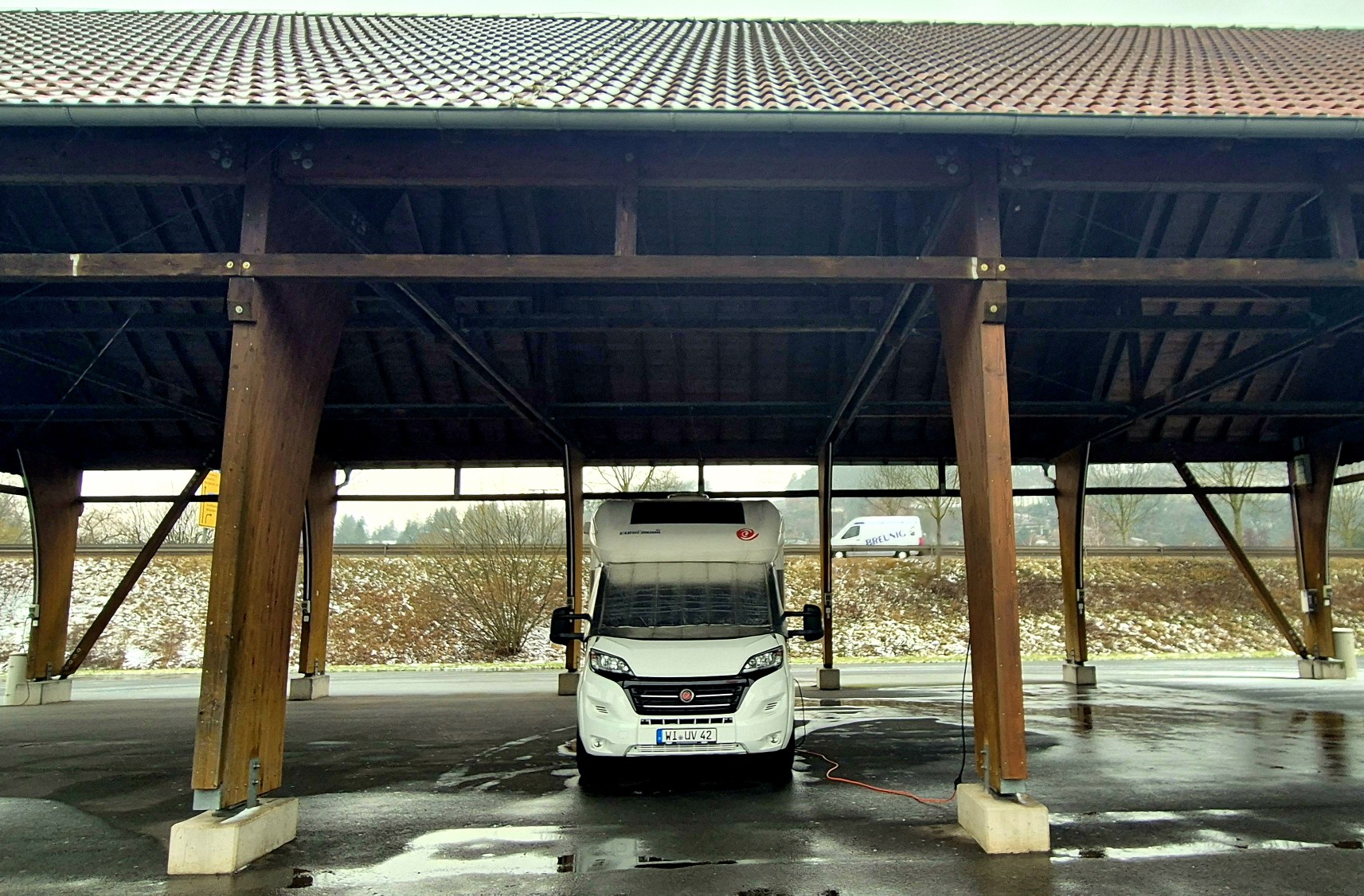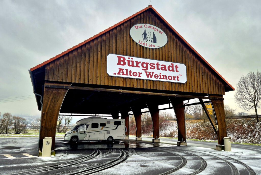In der Nacht setzt dann Tauwetter ein und es regnet fast ununterbrochen. Am Montag gegen 14 Uhr verlassen wir Miltenberg und stellen uns dein paar Kilometer weiter in Bürgstadt auf unseren ersten überdachten WoMo-Stellplatz EVER. Hier gibt es auch guten Strom für die leergelutschten Bordbatterien, Frischwasser für den fast leeren Tank und einen Ausguss für die beiden vollen Toilettenkassetten. Kostet 6 Euro Parkgebühr und 4 Euro Stromflatrate für 24 Stunden. Sehr fair!
