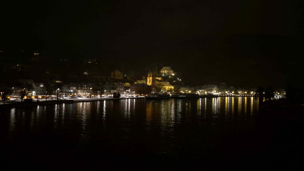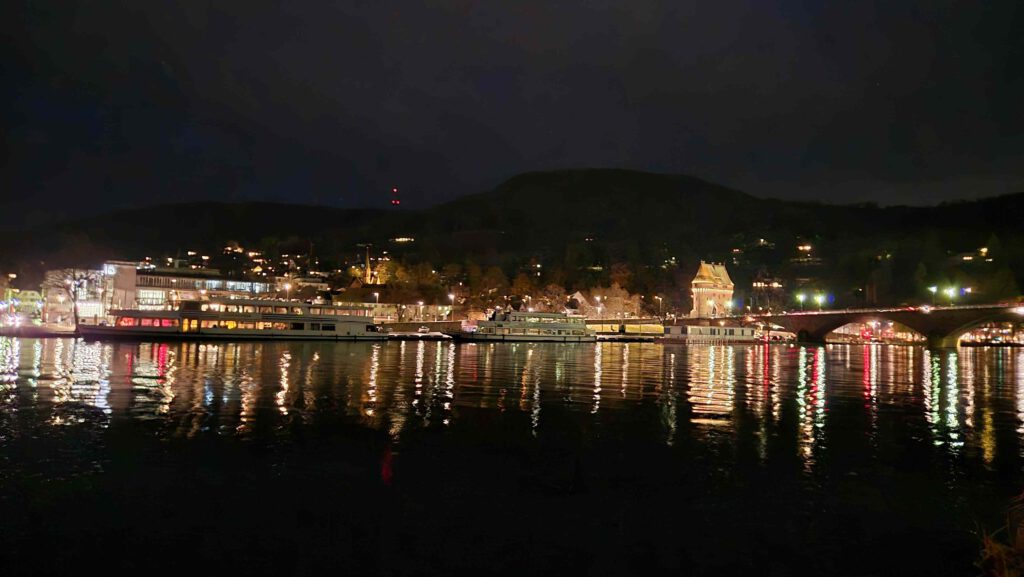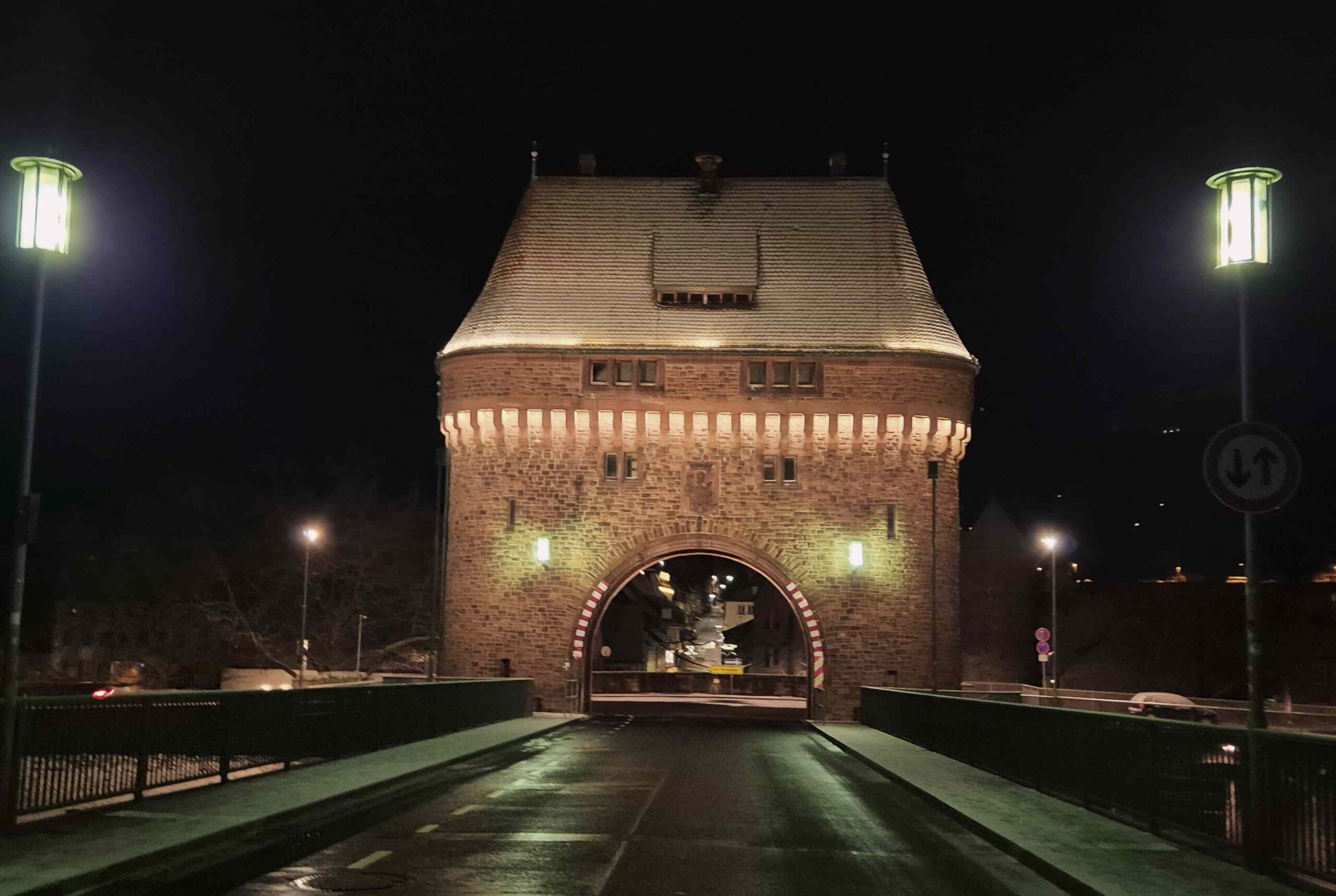 Um 19 Uhr geht es dann wieder über die Brücke mit Blick auf das abendlich erleuchtete Miltenberg zum Traditionsgasthof zum Riesen.