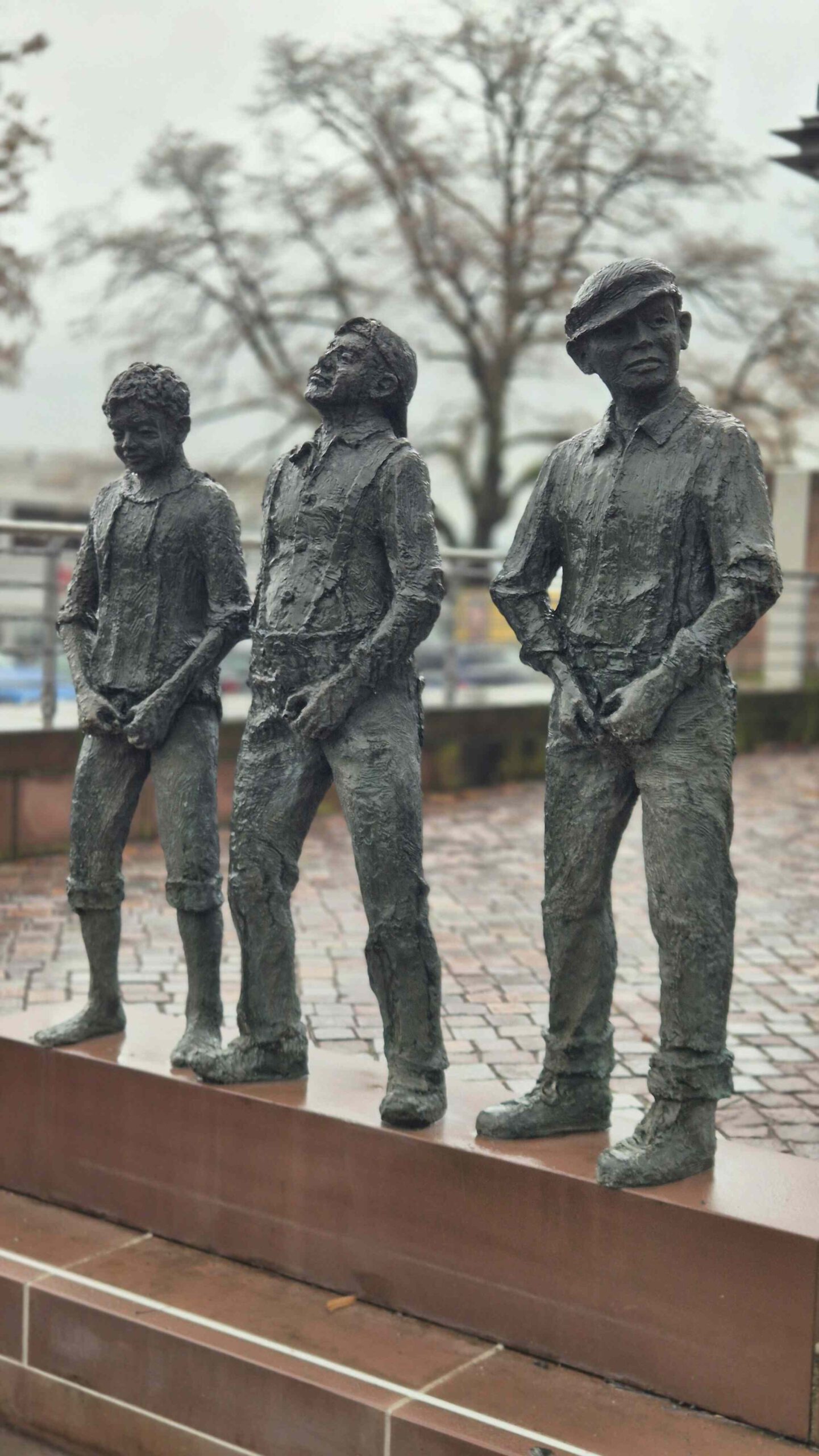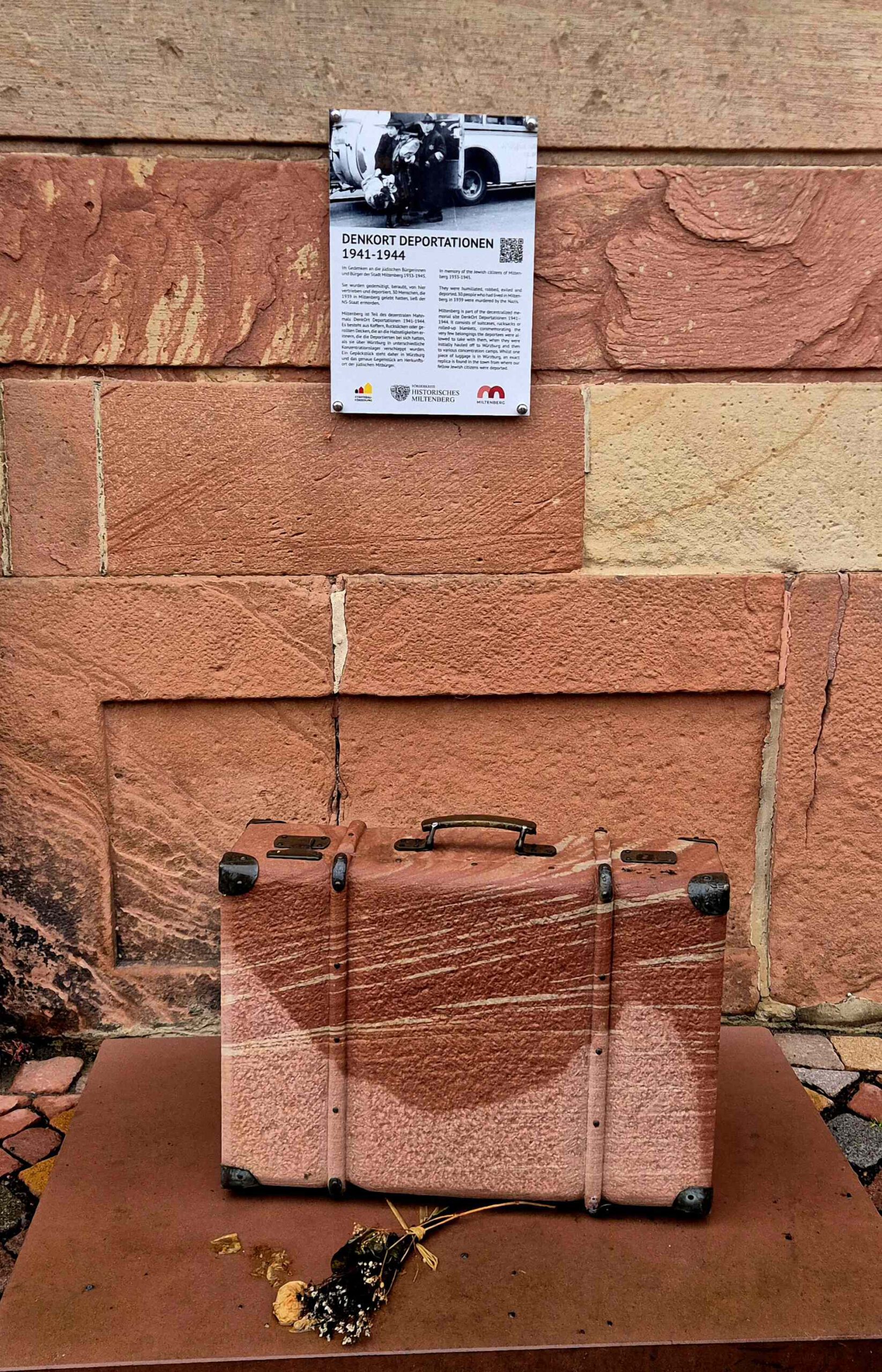 Der Koffer aus Sandstein, der am Engelplatz vor dem Rathaus steht, ist Bestandteil des dezentralen Mahnmals DenkOrt Deportationen 1941-44: Der gleichnamige Verein erinnert an die Deportationen Tausender jüdischer Menschen aus Unterfranken über den Bahnhof Würzburg. Dort mussten sie ihre Koffer, Taschen, Bündel zurücklassen. Der zentrale Gedenkort zeigt dort die zurückgelassenen Gepäckstücke und in den Herkunftsorten steht ein Pendant. 99 Gemeinden machen – Stand Januar 2026 – bereits mit.