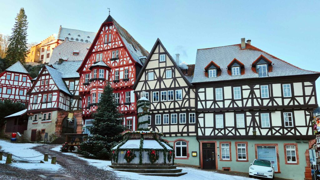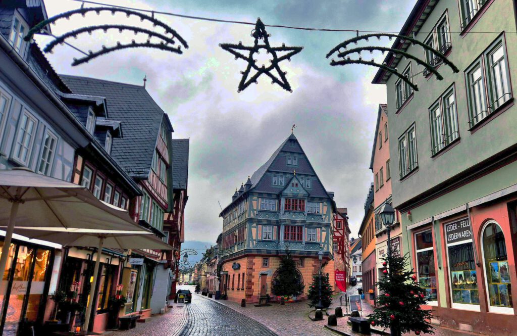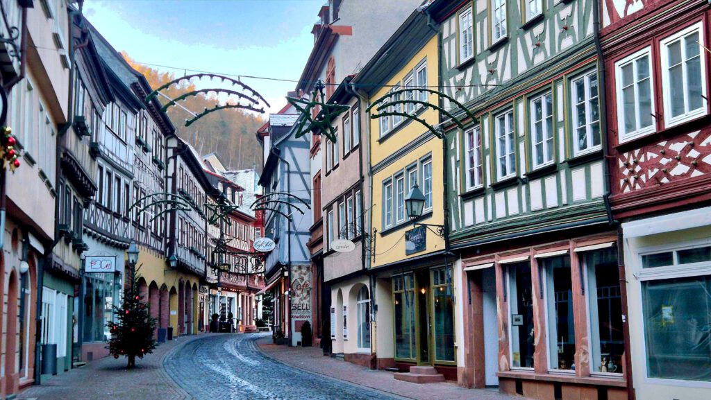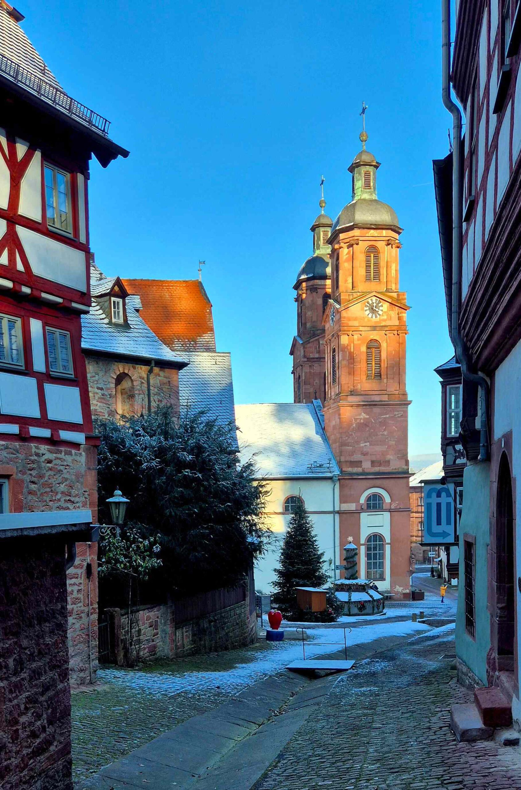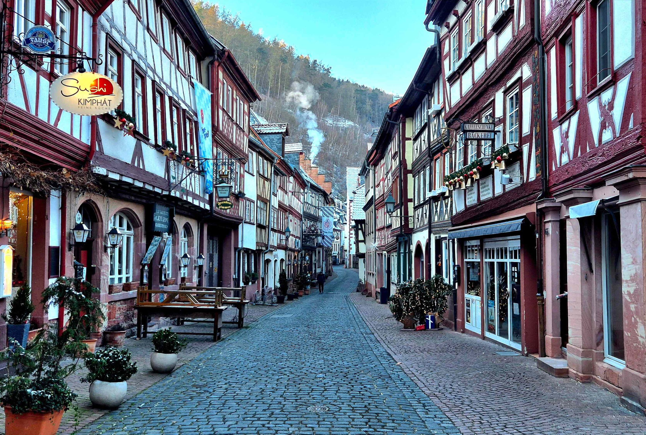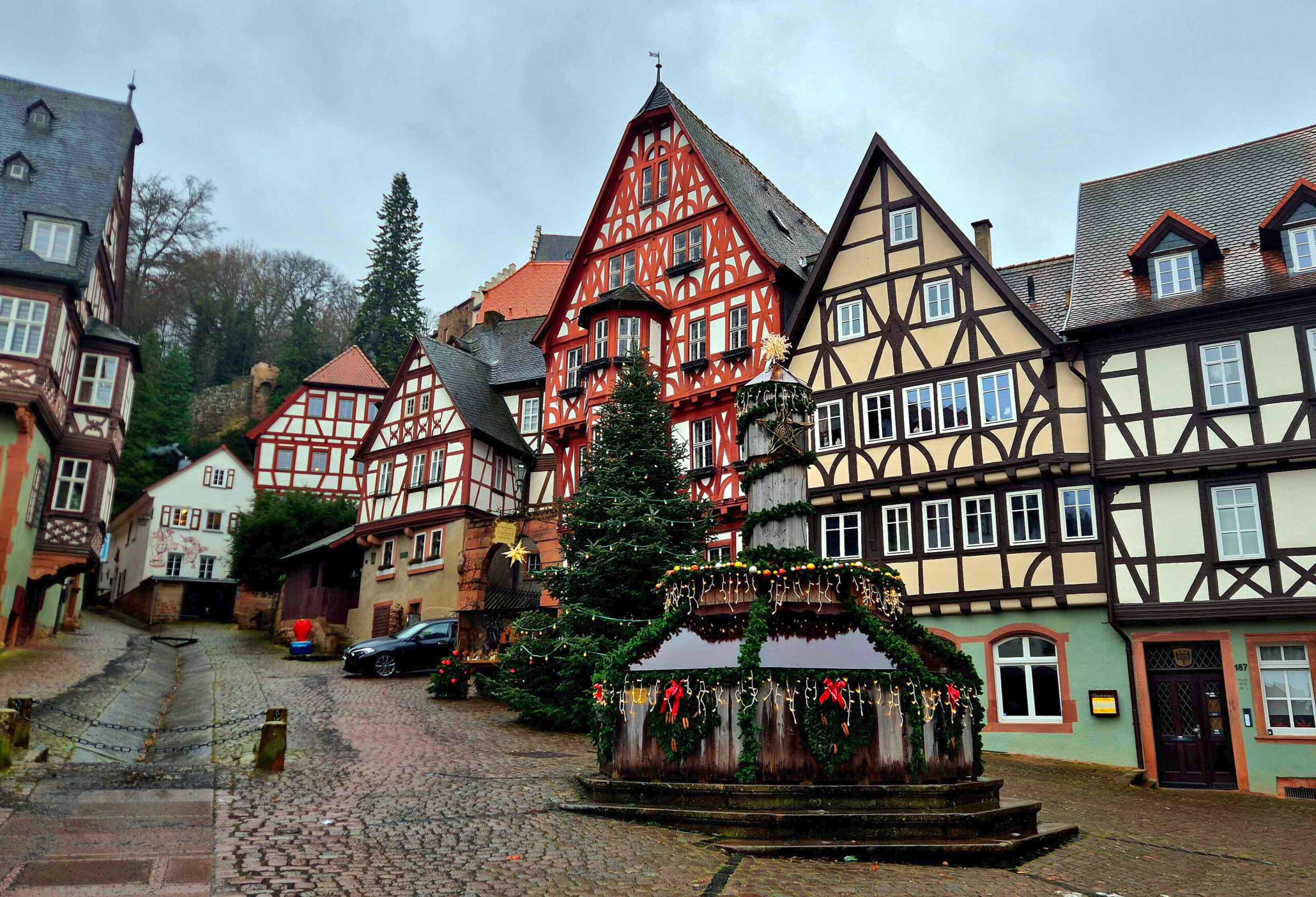 Zwischen dem Würzburger und dem Mainzer Tor erstreckte sich die Stadtmauer mit ihren an die 50 Türmen. Miltenberg gehörte bis 1803 zu Kurmainz, heute noch trägt die Stadt das Mainzer Rad im Wappen. Die Stadt war reich! Sie war Verwaltungssitz, hatte Steuerprivilegien und Stapelrecht und war ein Zentrum der Holz- und Steinindustrie. Aus dem Buntsandstein fertigte man Mühlsteine, Sarkophage, Mauersteine und Einfassungen und riesige Säulen, die Heunensäulen. Der Mainzer Dom ist aus Odenwälder Buntsandstein gebaut und die große Heunensäule auf dem Mainzer Domplatz ist ein Geschenk der Stadt Miltenberg. In den Wäldern um Miltenberg liegen noch mehr dieser großen Säulen rum. Der Reichtum der Stadt dokumentiert sich bis heute in den prachtvollen Bürgerhäusern, aus Stein und aus Fachwerk. Einen verheerenden Stadtbrand gab es hier zum Glück nicht.