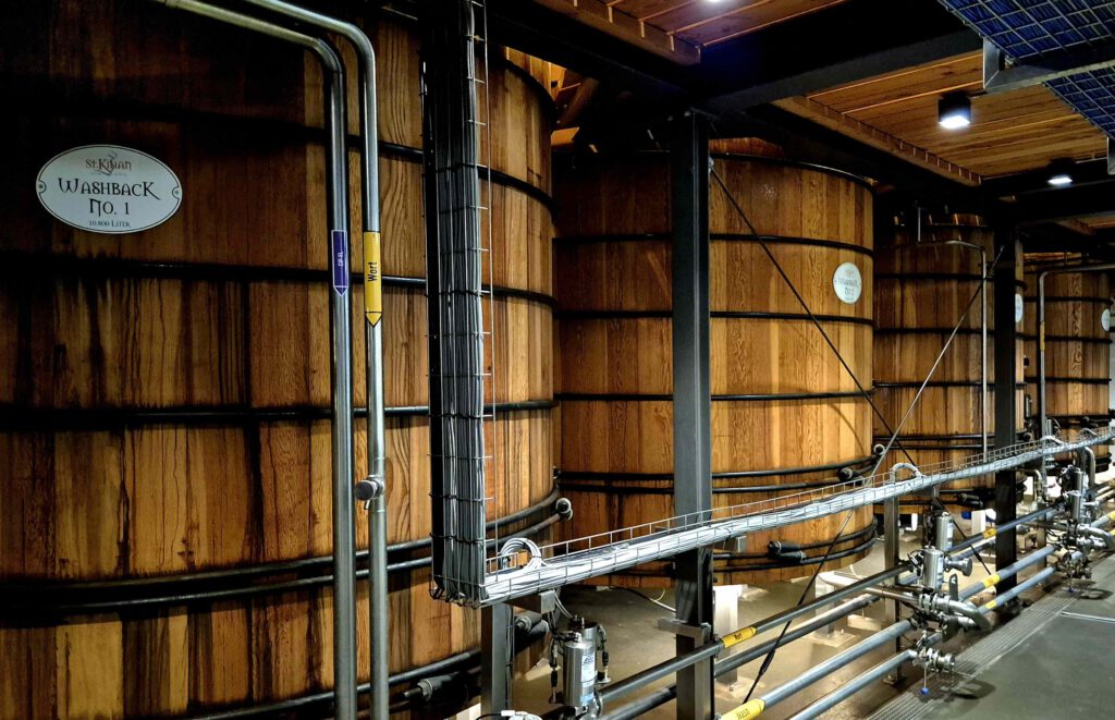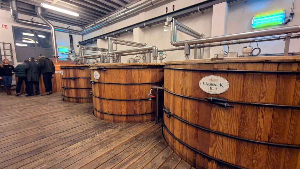 Das „Zuckerwasser“, Wash genannt, wird abfiltriert und kommt zum Gären in die fast ebenso riesigen Washbacks.
