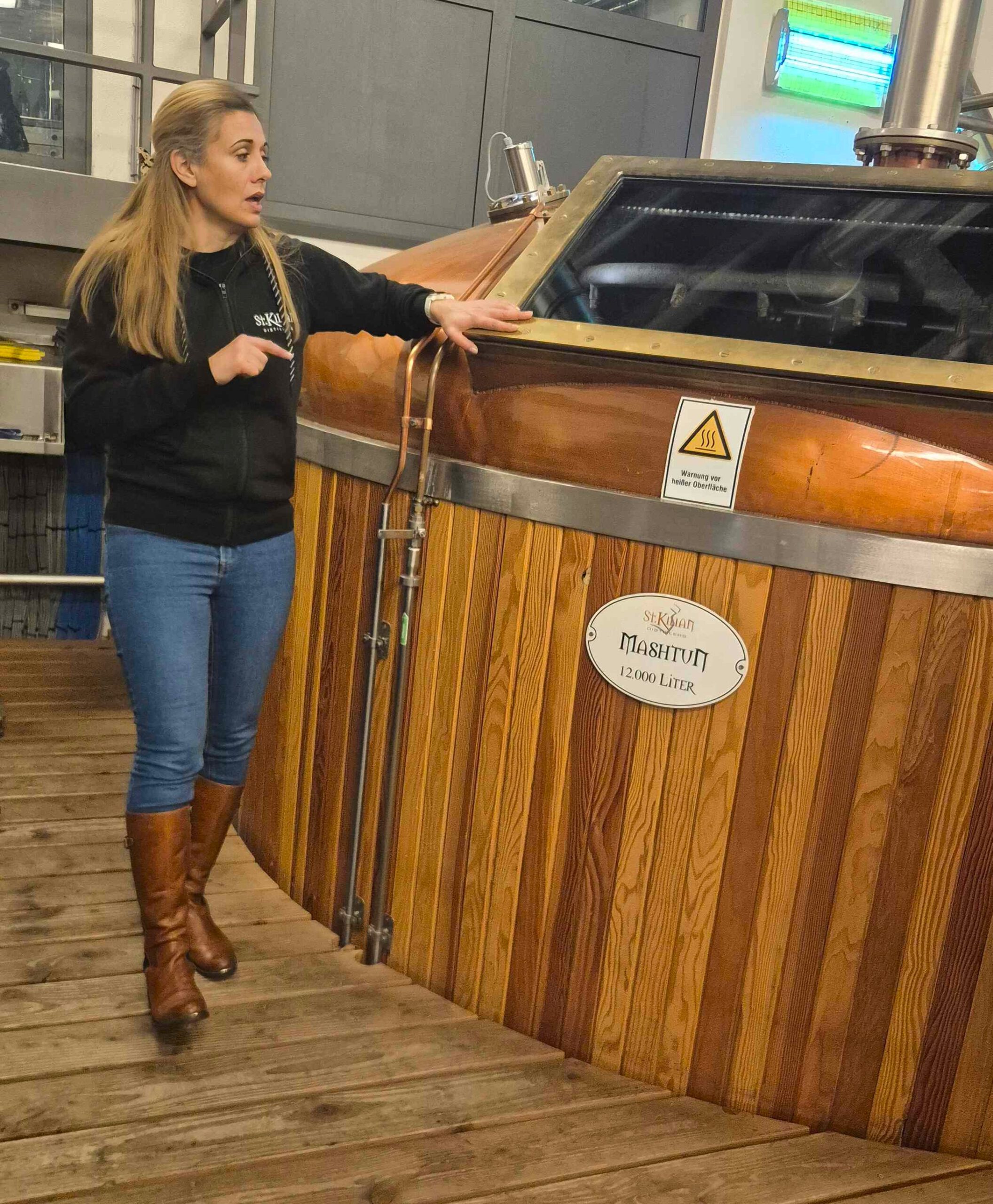Das Malz wird fein geschrotet und kommt dann mit heißem Wasser in den Mashtun, einen riesigen Kupferbottich (12.000 Liter), wo die Gerstenstärke enzymatisch in Glucose gespalten wird.