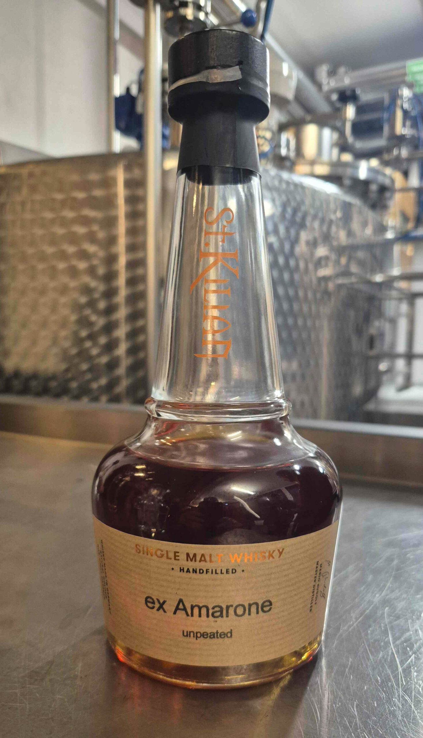 Kilian füllt auch direkt nach dem Brennen ein kristallklares Gesöff ab, das sie New make nennen (rechts im Bild), 63,5 Umdrehungen, das hab ich nicht probiert! Die Flaschenform ist übrigens oft an die Form der Brennblase angelehnt.