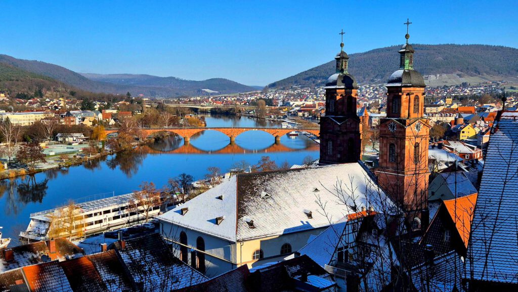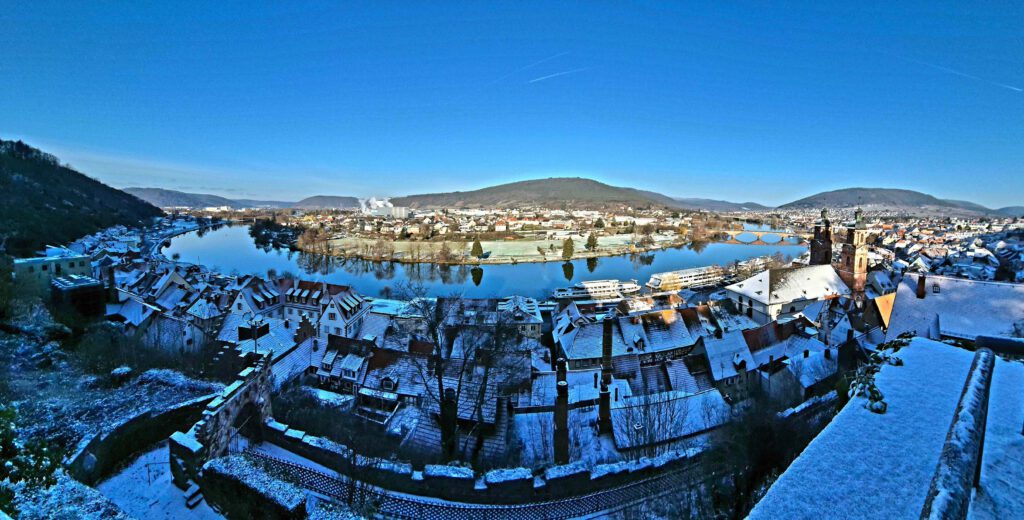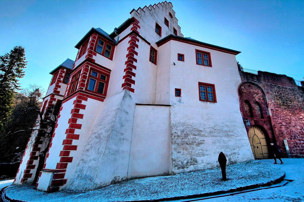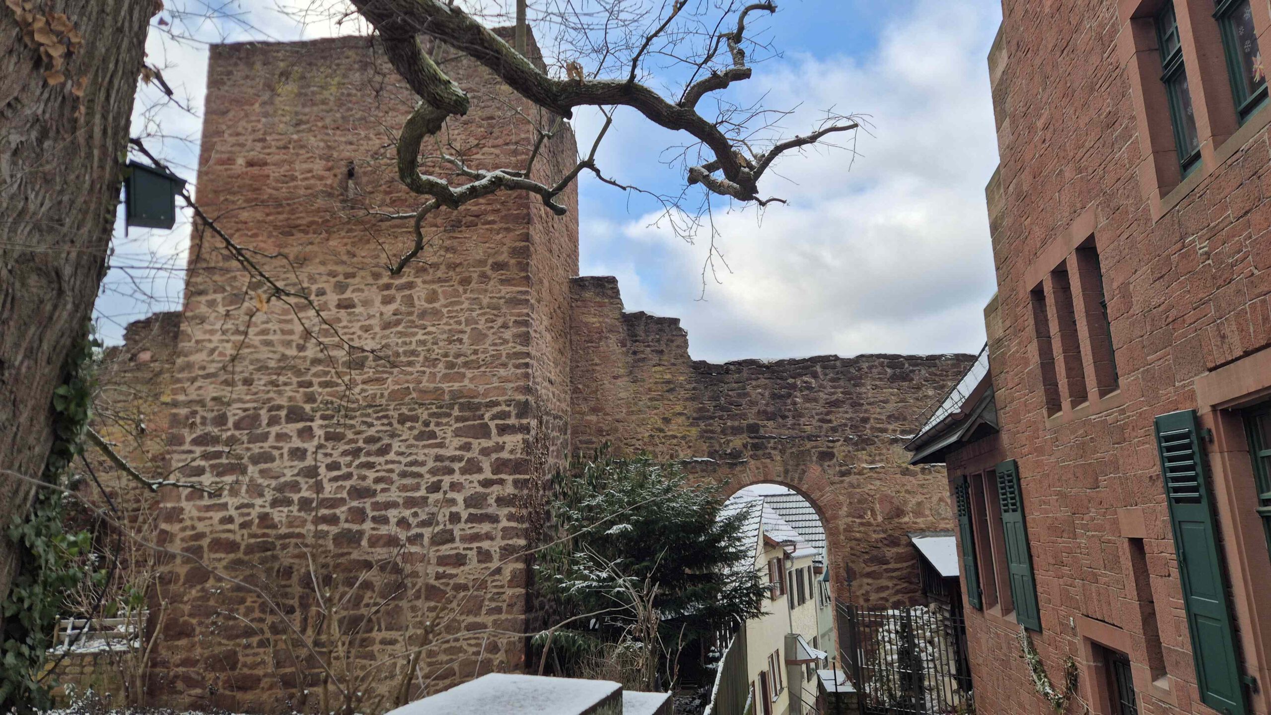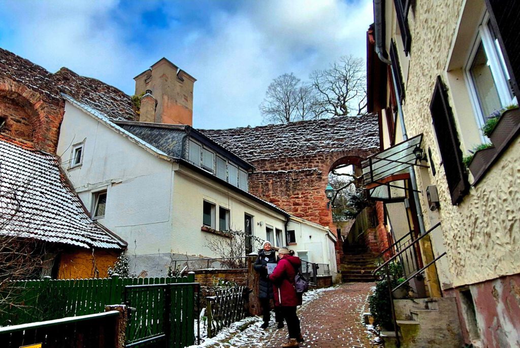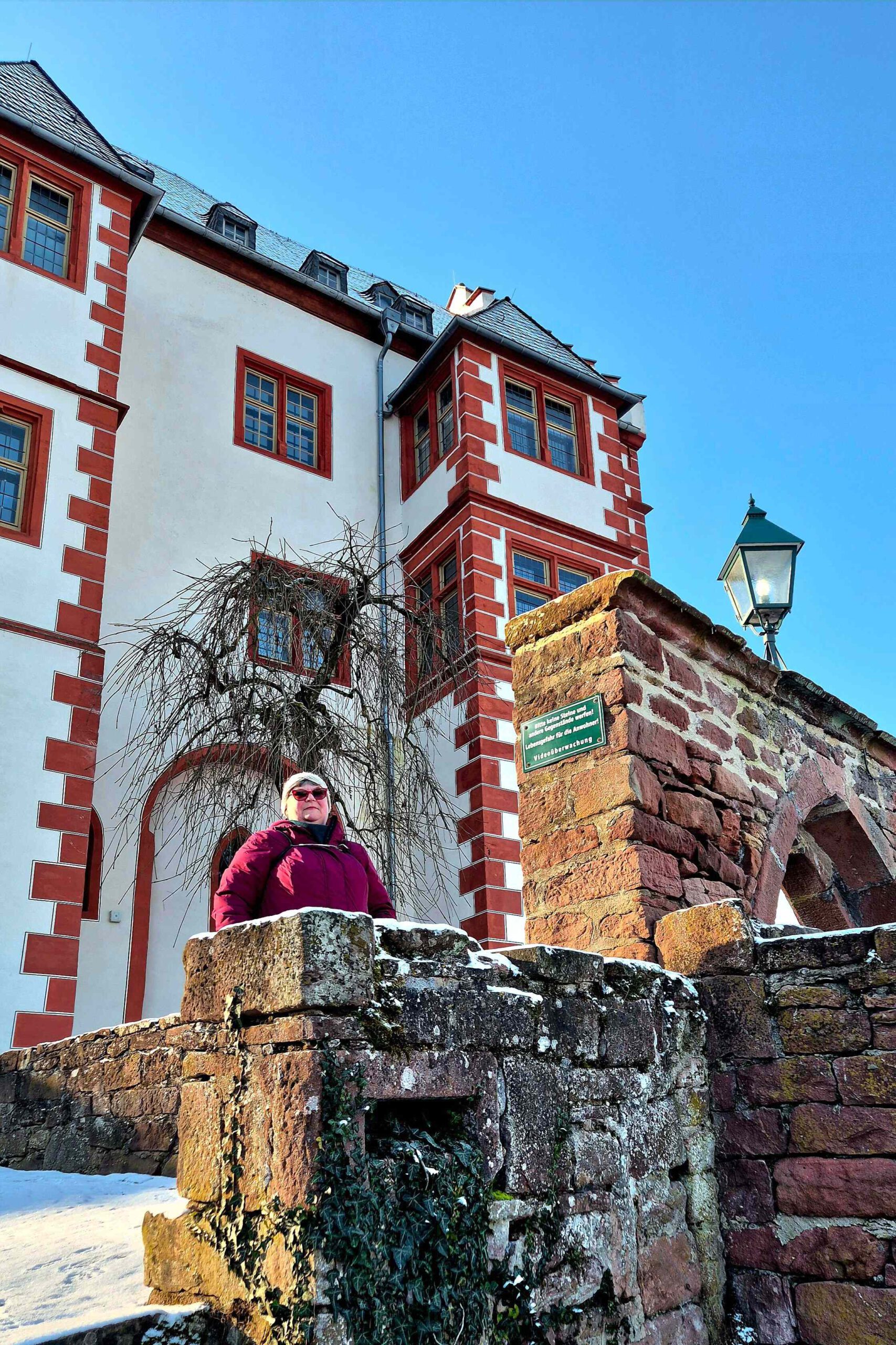 Dann geht es hoch zur Burg, zum Glück liegt die nicht wirklich sehr hoch und der Weg ist dank Stufen und Geländer trotz Schnee sicher begehbar. Wir werden mit einem wirklich fantastischen Blick über Miltenberg belohnt.