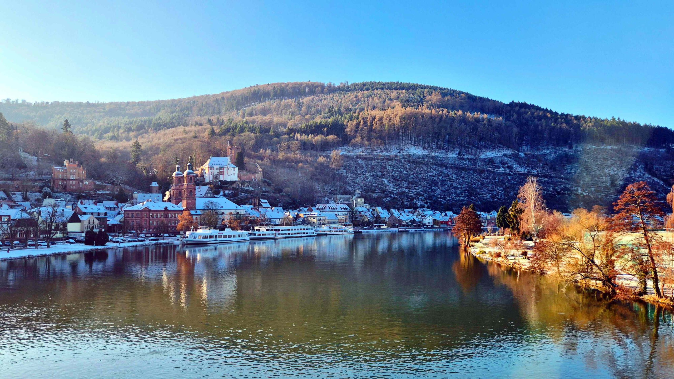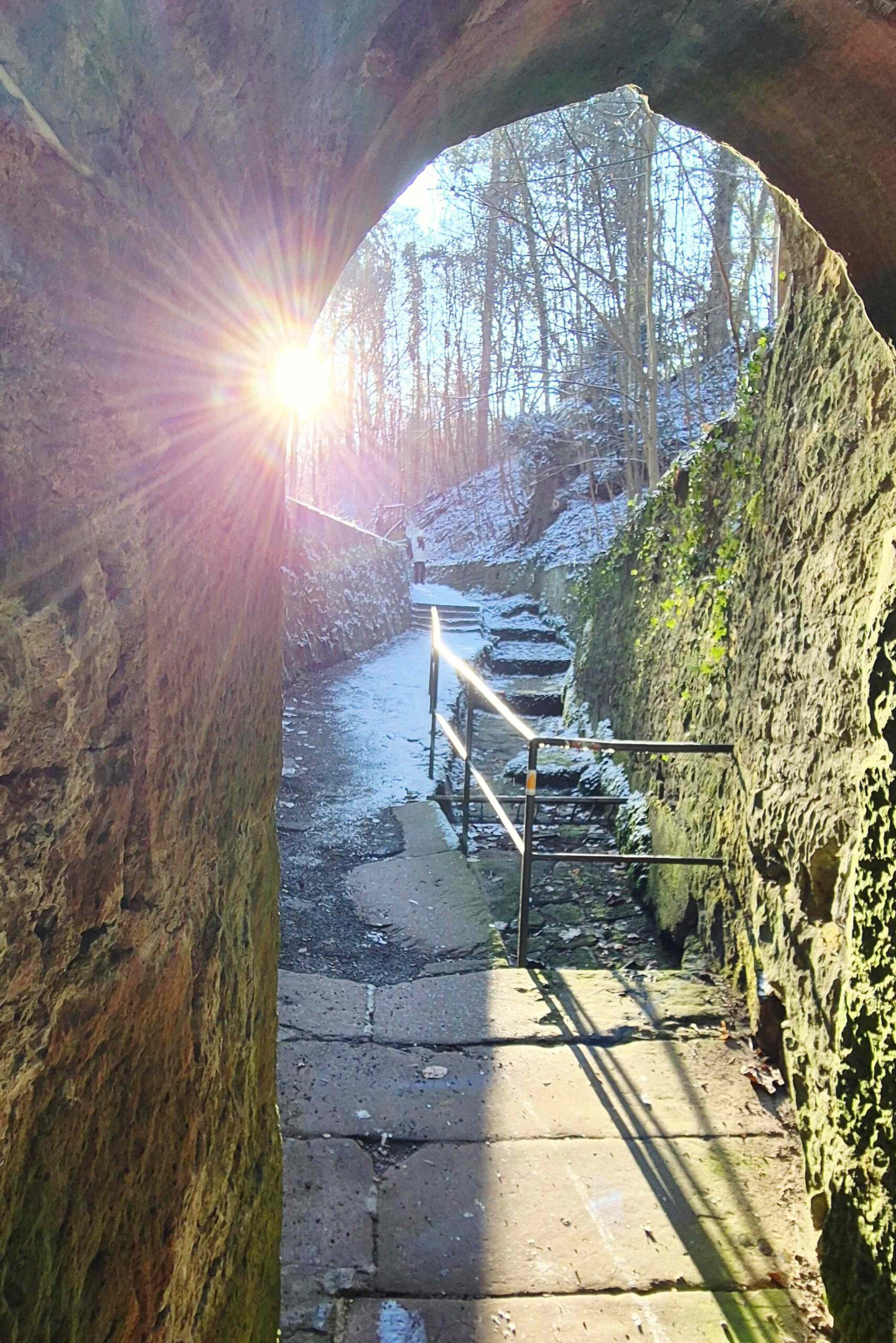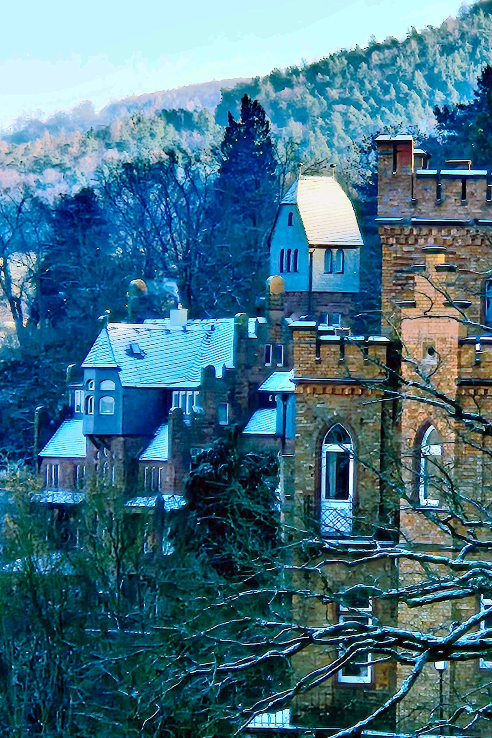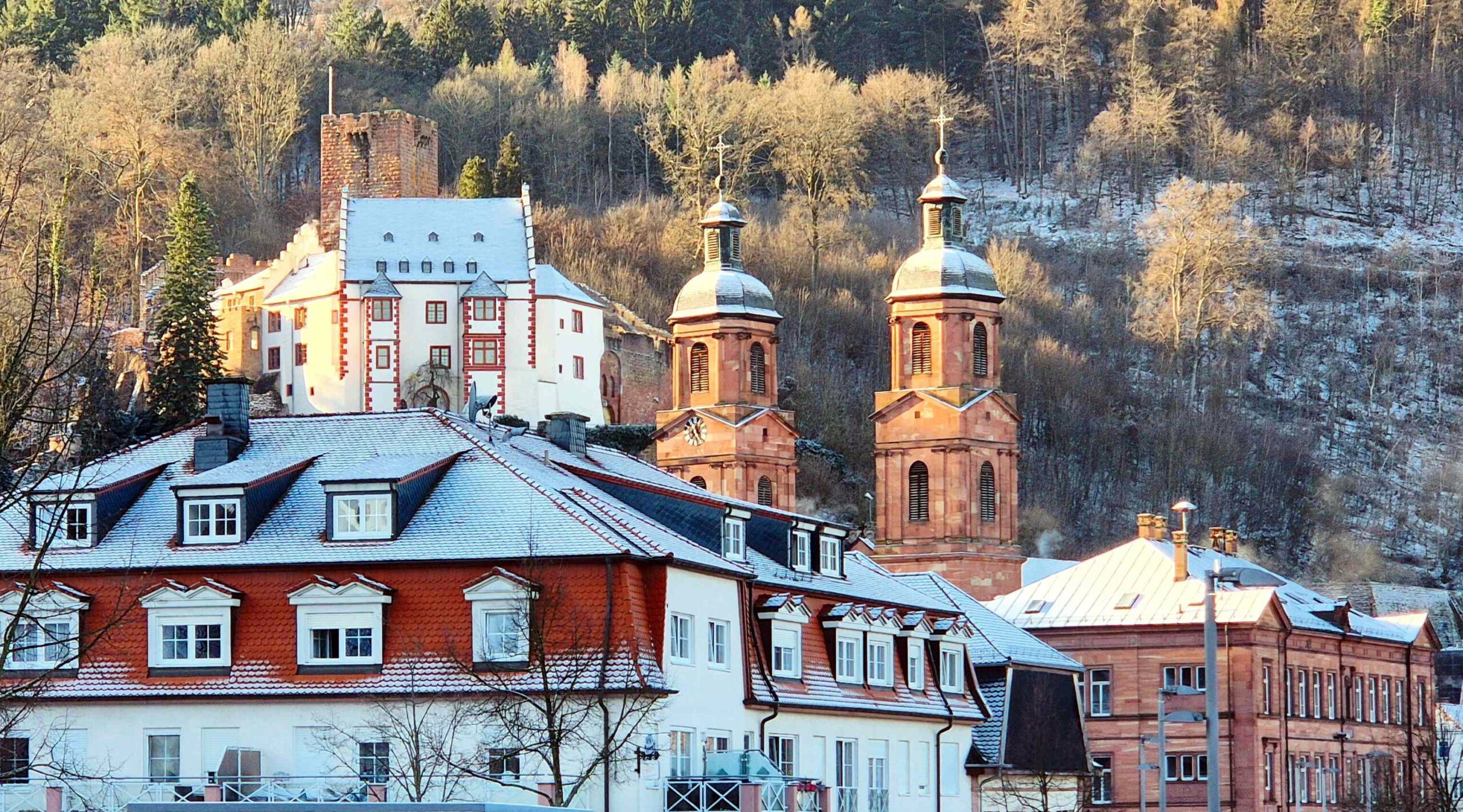 Dann geht es hoch zur Burg, zum Glück liegt die nicht wirklich sehr hoch und der Weg ist dank Stufen und Geländer trotz Schnee sicher begehbar. Wir werden mit einem wirklich fantastischen Blick über Miltenberg belohnt.