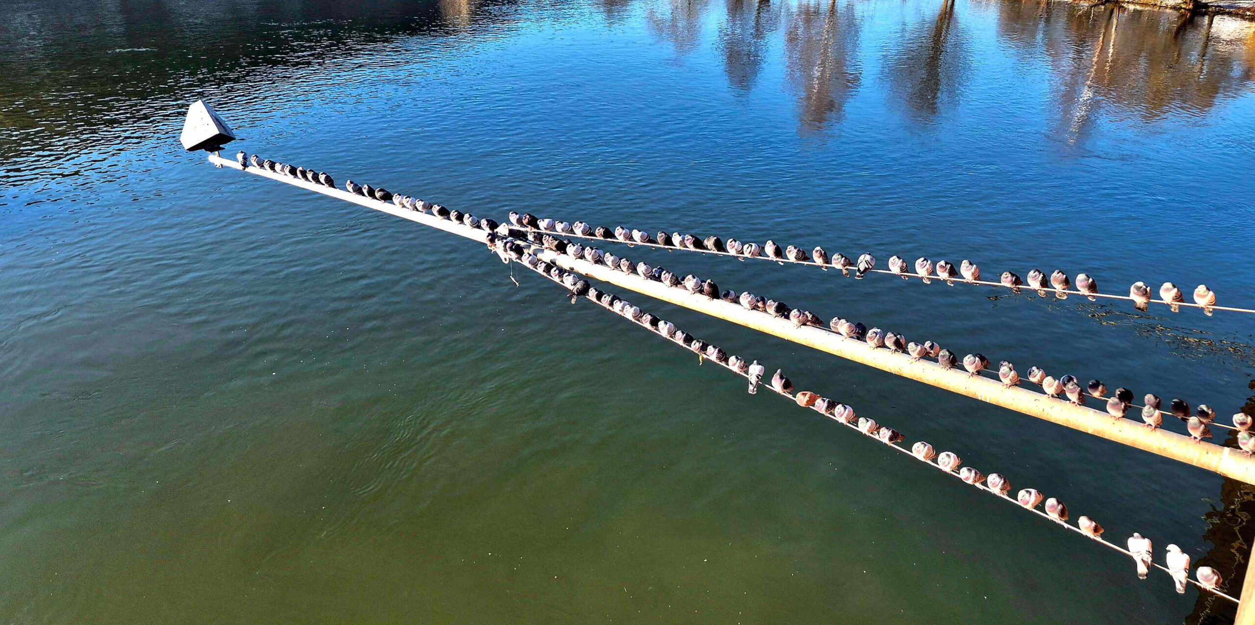 So haben sich wohl sämtliche Miltenberger Tauben verabredet, hier auf dem Ausleger an der Brücke ein Sonnenbad zu nehmen.