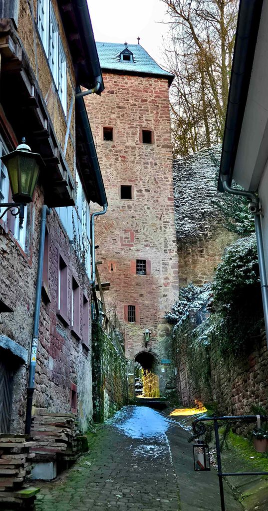 Dann steigen wir die paar Meter hoch zum Schnatterlochturm, ein gut erhaltenes Stadttor in der alten Stadtmauer. Dahinter ist auch heute noch Miltenberg zu Ende und man betritt den Wald. Oder beträte – denn wir tun das nicht.