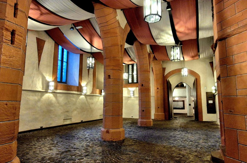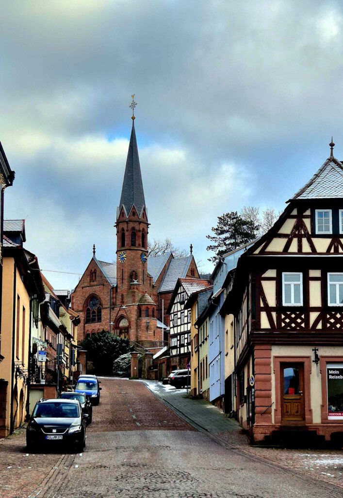 Gleich zu Anfang werden schon direkt um uns herum einige Frage- in Ausrufungszeichen verwandelt: Die hübsche neugotische Kirche ist ein evangelisches Gotteshaus im eigentlich katholischen Miltenberg, errichtet 1897 auf Veranlassung eines reichen evangelischen Bürgers für sich und die damals ca. 400 lutherischen Einwohner.