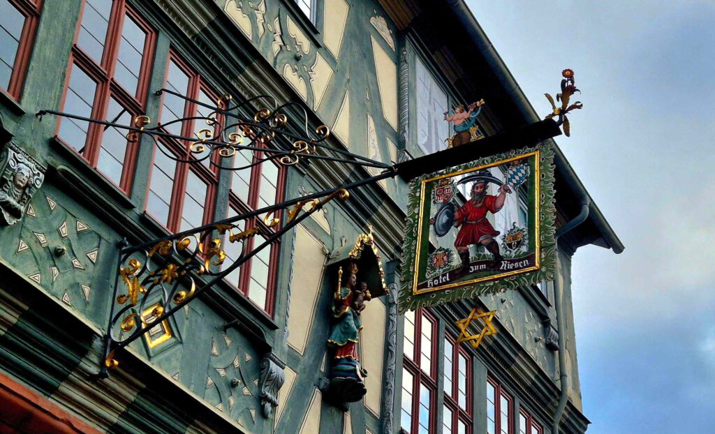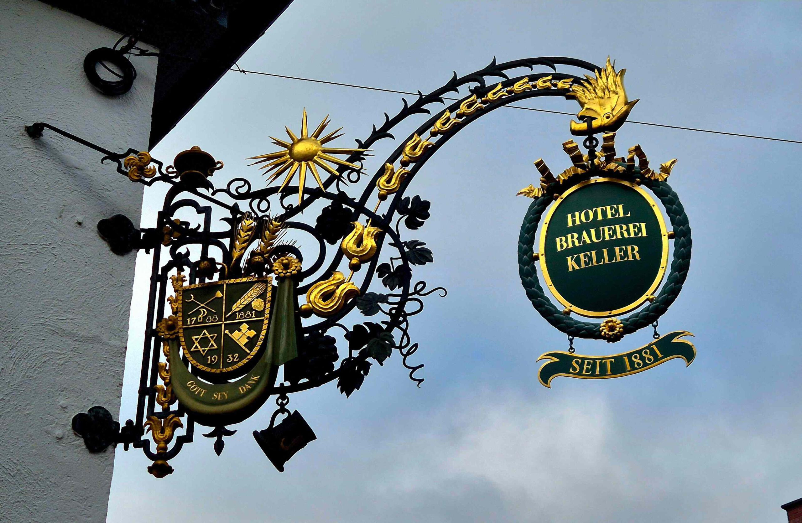 Unsere zweite Frage gilt dem prächtigen Wirtshausschild des Brauereikellers (leider dauerhaft geschlossen). Der vermeintliche Davidstern sei der Braustern, Zunftzeichen der Mälzer und Brauer. Die sechs Dreiecke sollen die Elemente Feuer, Luft und Wasser und die Zutaten Malz, Wasser und Hopfen symbolisieren. Der Braustern diente früher den Leute als Wegweiser zum Bier.