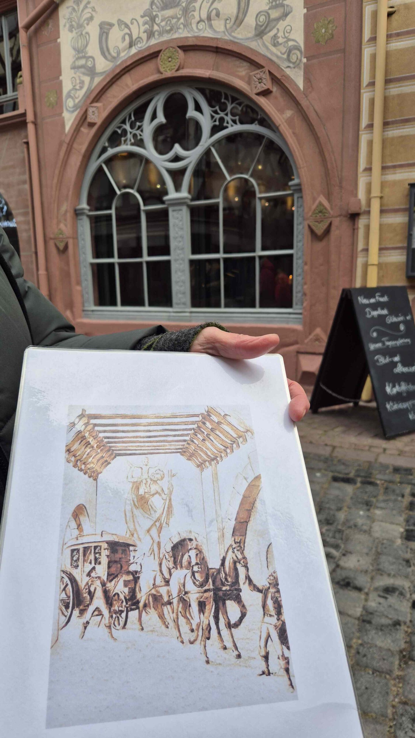 Natürlich zeigt uns Angelika auch das Haus zum Riesen und erklärt, dass der heutige Gastraum die „Lobby“ war, wo die Kutschen zu einem Tor rein und zum anderen wieder rausfahren konnten. Die illustren Gäste konnten im Sauberen und Trockenen aussteigen, zudem geschützt vor neugierigen Augen.