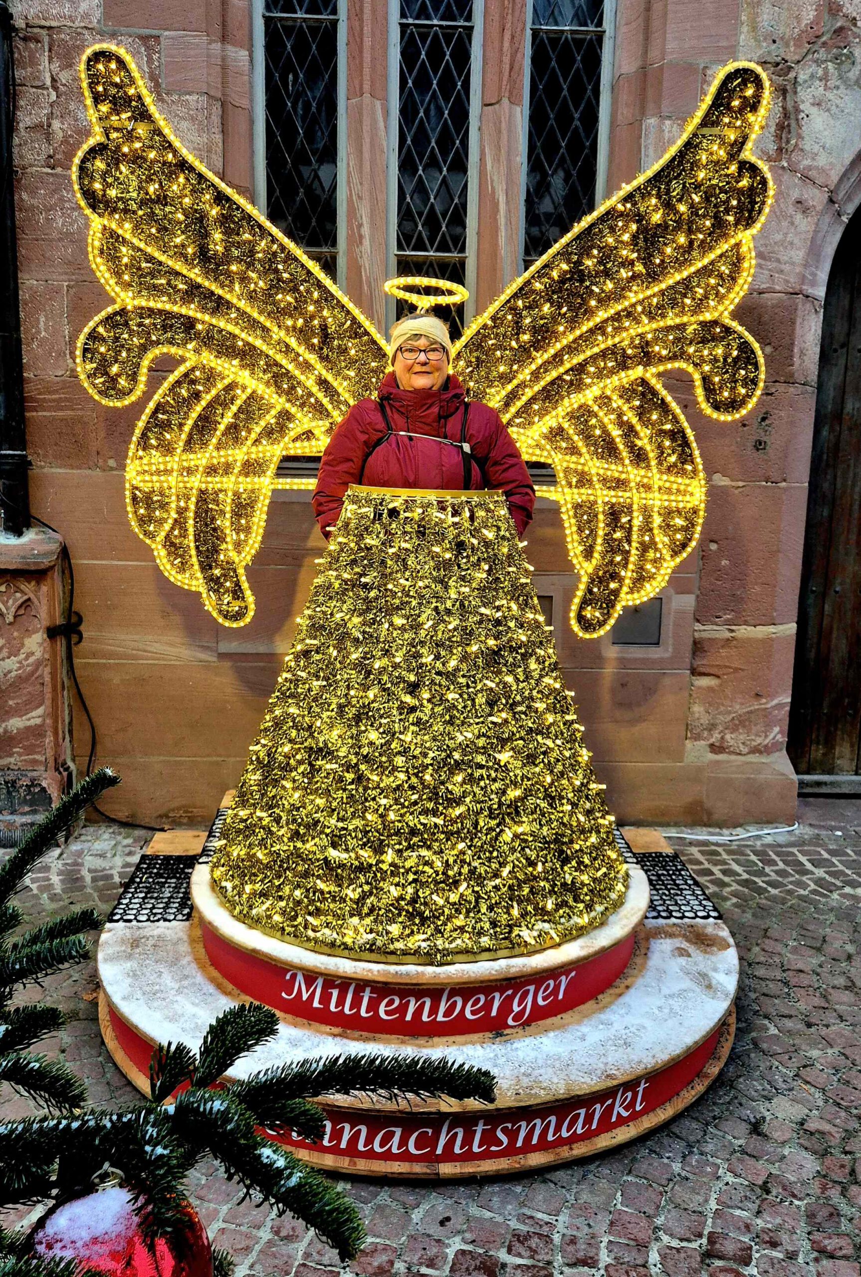 Nach einer herzlichen Verabschiedung* wärmen wir uns im Café Sell bei Kuchen und Kaffee auf und machen uns dann auf den Heimweg. Doch HALT – was ist das: Der Rauschgoldengel vor dem alten Rathaus ist erleuchtet. Das kann ich mir nicht entgehen lassen. Ich finde, dass mir Flügel und ein Heiligenschein gut stehen.