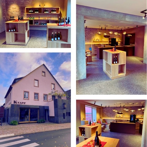 Weil wir für den nächsten Streich ein halbes Stündchen zu früh dran sind, gehen wir Richtung Brücke zur Vinothek Knapp, vor der die Ape des Seniors anzeigt, dass er da ist. In der Tat hockt er hinter dem schicken Tresen und macht Buchführung. Eigentlich ist nicht geöffnet, aber nach dem Ehda-Prinzip 🤷♂️gibt‘s doch ein Piffchen: trockenen Gewürztraminer für mich und eine rote Domina für Volker, aus dem Knappschen Weingut, das inzwischen der Sohn leitet. Scheinbar sind wir interessanter als die Fibu und unterhalten uns angeregt, bis wir dann aber fix wieder los müssen.