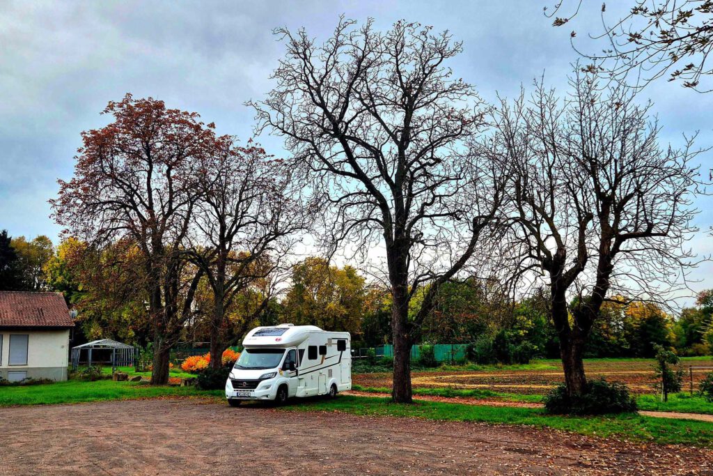 Dann beziehen wir Quartier in Meckenheim bei Deidesheim, ein ruhiger Stellplatz am Ortsrand, 10 Euro Gebühr kann man per App zahlen und es gibt komplette V+E nebst Strom, perfekt!