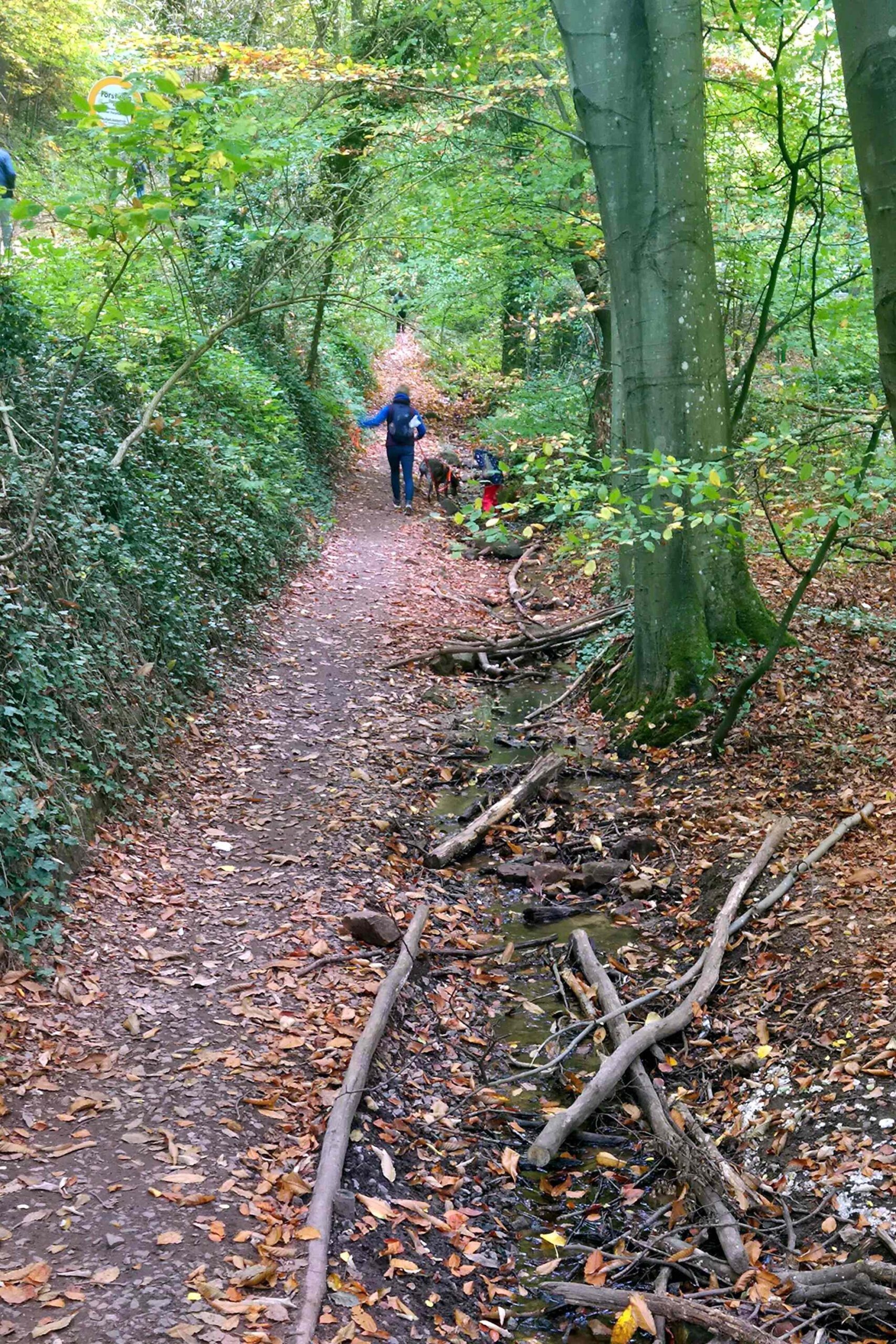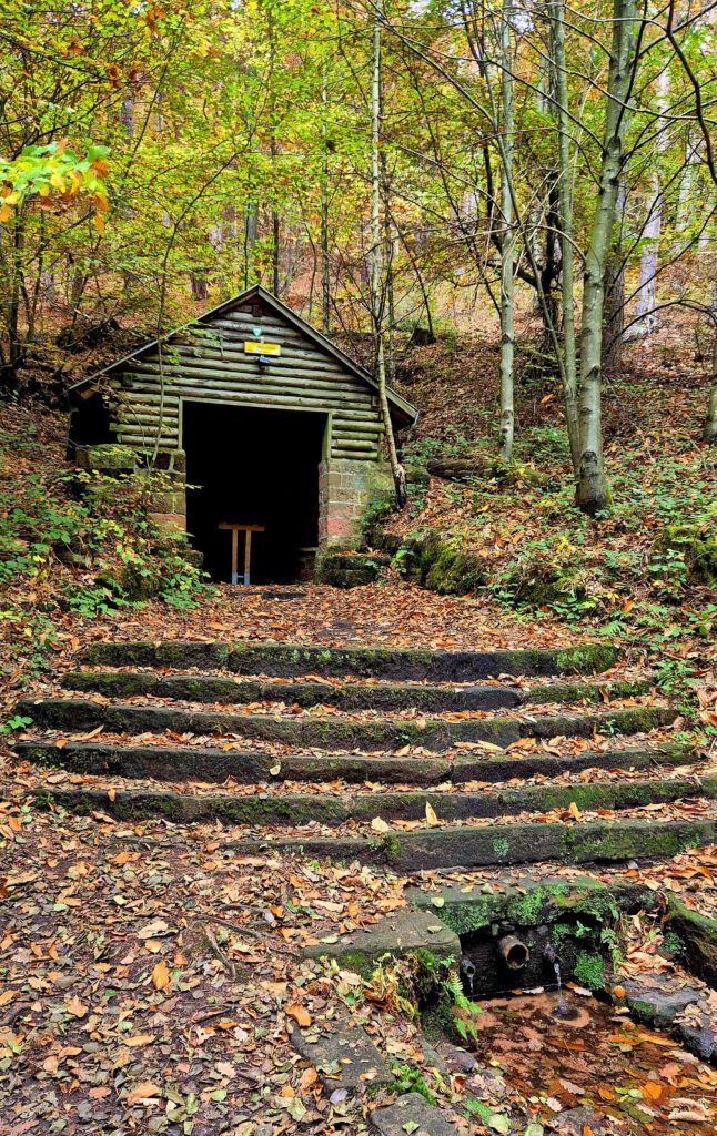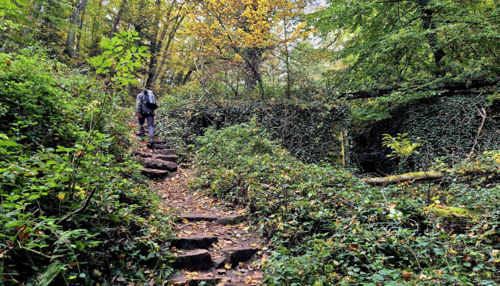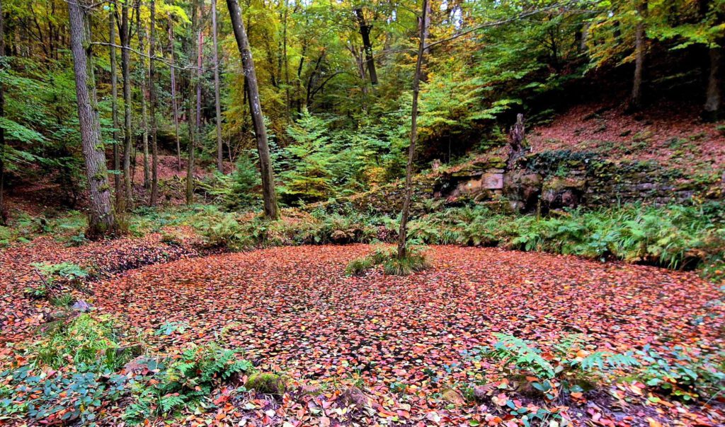 Der führt zunächst entlang des kleinen Weinbachs, an dem früher zahlreiche Mühlen lagen, die durch einen oberhalb gelegenen aufgestauten Mühlteich mit Wasser versorgt wurden.