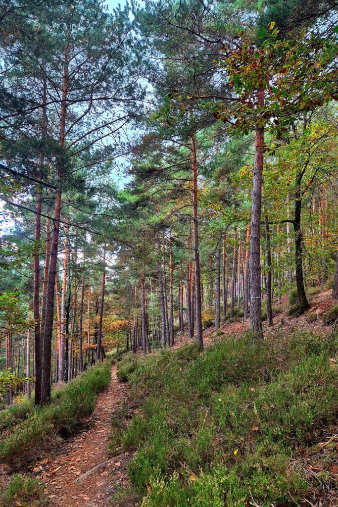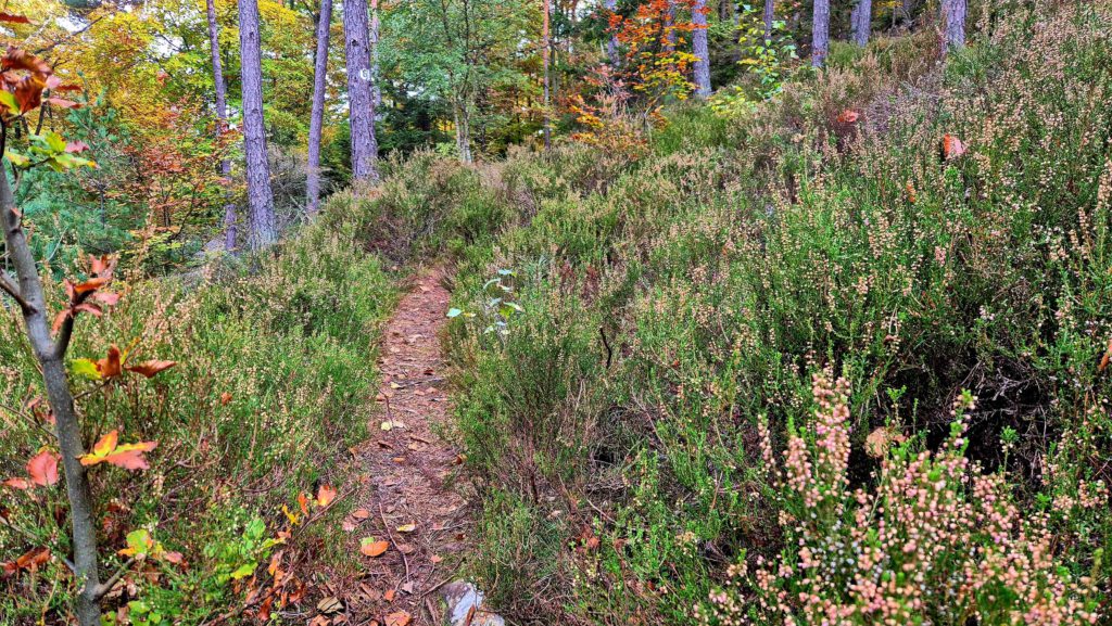 Nach ein paar Kilometern, kurz vor dem Wendepunkt der Wanderung, geht es durch Kiefernwald mit viel Heidekraut.