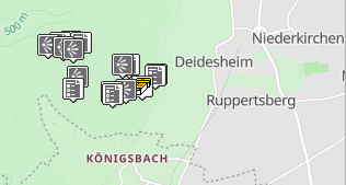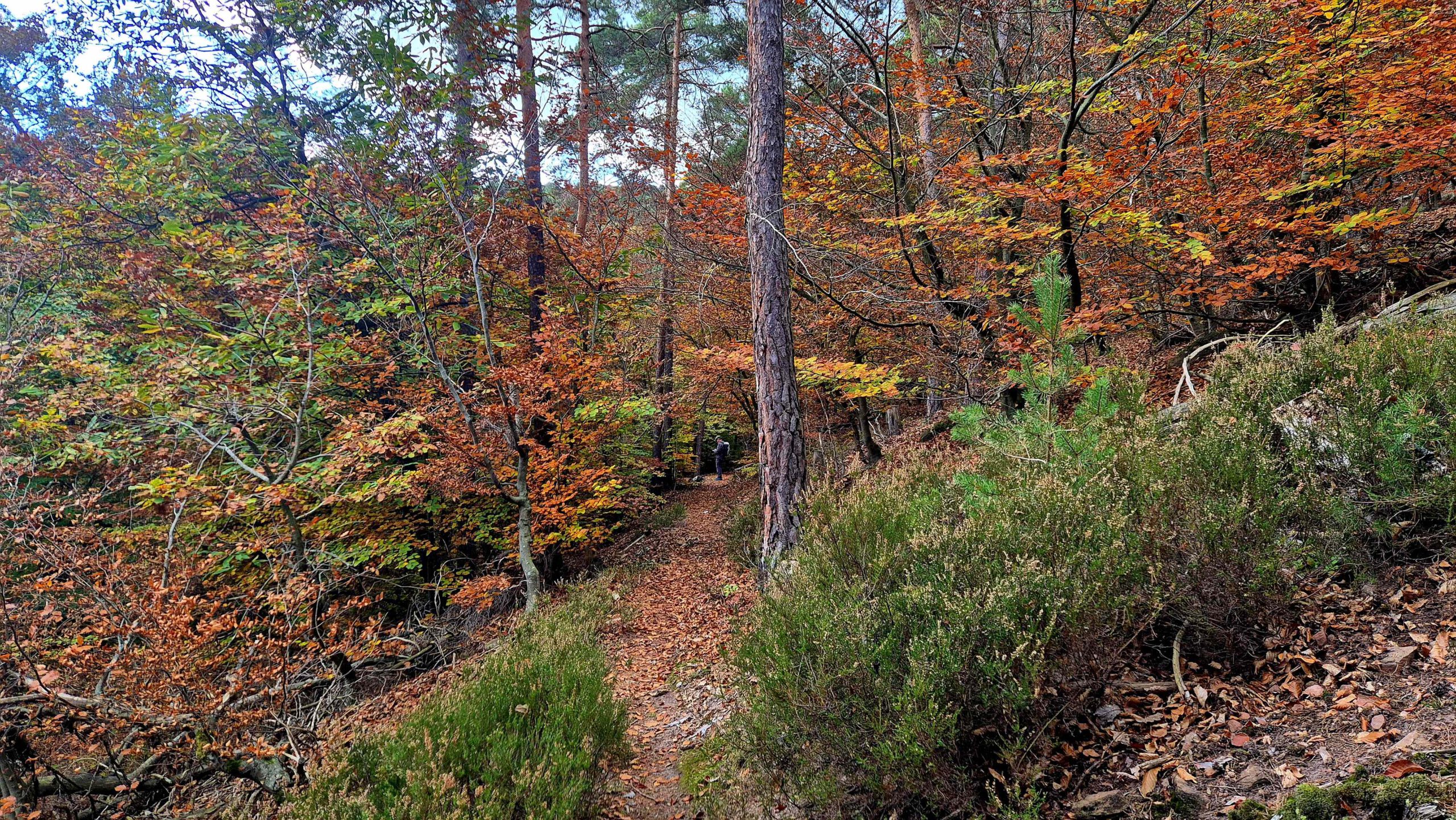 Ich finde es immer wieder faszinierend, wie der Pfälzer Wald so völlig unvermittelt aus der Ebene hochploppt: Alles ist flach und mit Weinstöcken bepflanzt und schwuppdiwupp bist du im Wald und es geht den Bersch enuff. Das sieht auch auf der Landkarte immer aus, als wäre einer mit dem Rasenkantenschneider entlang gegangen.