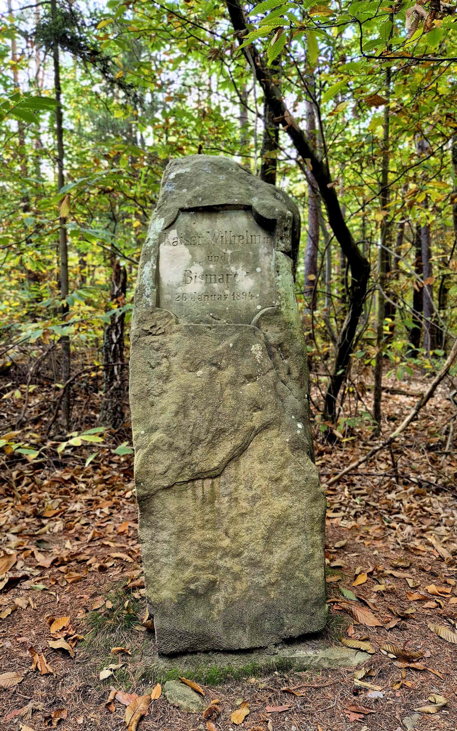 Gegen Ende der Route kommen wir am Bismarckstein vorbei. Ich glaube es gibt kaum eine Persönlichkeit, die in Deutschland mehr Denkmäler hat als der olle Reichskanzler. Update: Kiki (meine KI) bestätigt das: Platz 1 Otto, Platz 2 Willi I.). Hier sind Bismarck und Wilhelm II. auf einem Stein gemeinsam verewigt, aber das Dings heißt nicht Wilhelmstein, sondern Bismarckstein.