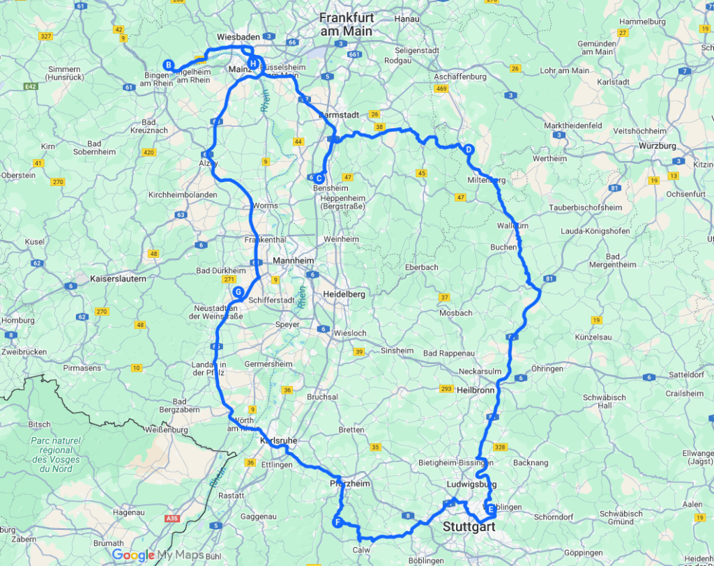 Naja, was soll ich noch schreiben, unser Herbstwech ging immerhin über 623 km. Was mich allerdings am meisten wunderte, ist, dass man von Mainz nach Stuttgart auch entlang des Mains bis auf Höhe Miltenberg fahren kann, um dann stramm nach Süden abzubiegen. Und dies ist kein Kilometer länger. Hier musste ich dann doch Uschi, auch etwas kleinmütig, recht geben 🤗